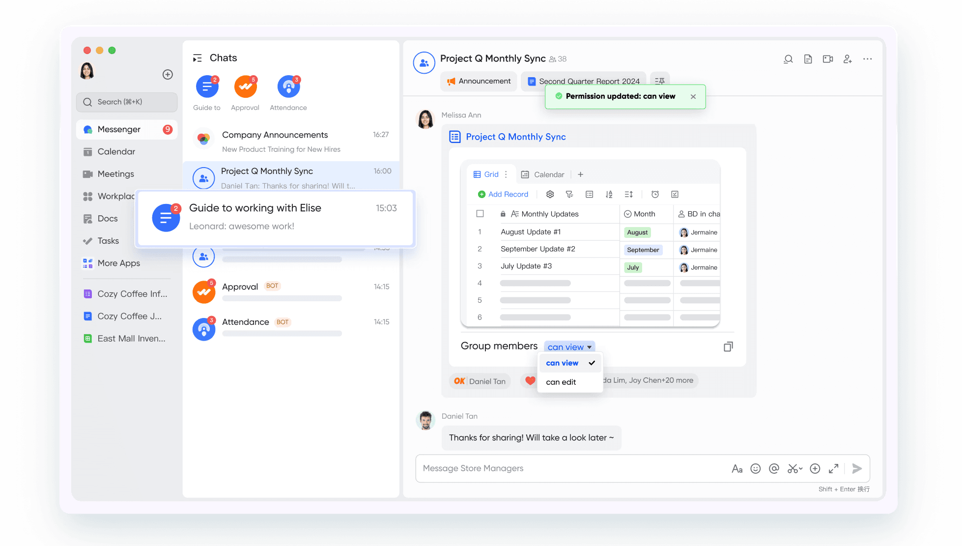 Lark's all-in-one solution transformed this chaotic workflow. With documents and chat integrated into a single superapp, every interaction became seamless. Tagging a person within a document or leaving a comment automatically notified them on chat. Additionally, tasks could be created directly from within the app, ensuring nothing slipped through the cracks.