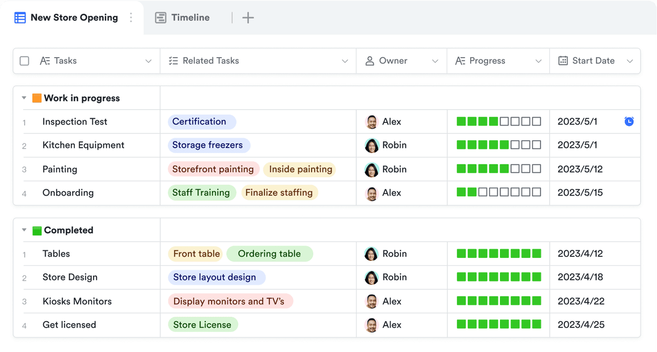 "We aim to have hundreds of locations in the years to come, and we're using the Lark to standardize our playbook. So for every single new store to be opened, the launching team knows what to do, and then they don't need to reinvent the wheel," says Toby. So, every time Zero& launches a new store, they go through a standardized process for launching new stores on Lark. They track all progress on one dashboard, assign tasks to specific owners, and create deadlines to ensure each store opens on time.