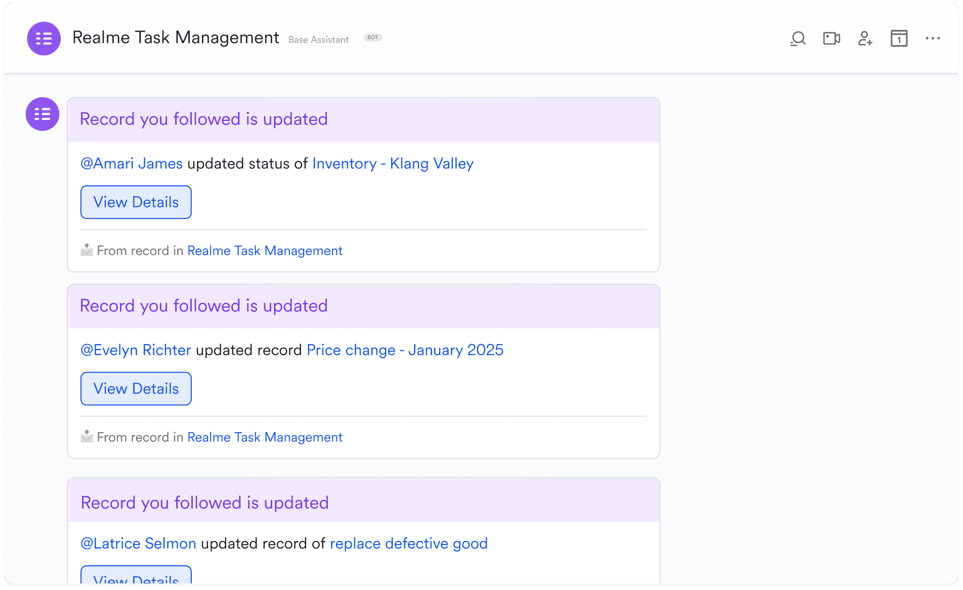 Base-powered execution: Leaders decide to change price in the boardroom. Brand store managers in HQ are activated to have the price change executed in stores across the country. They communicate with store operators via Lark.