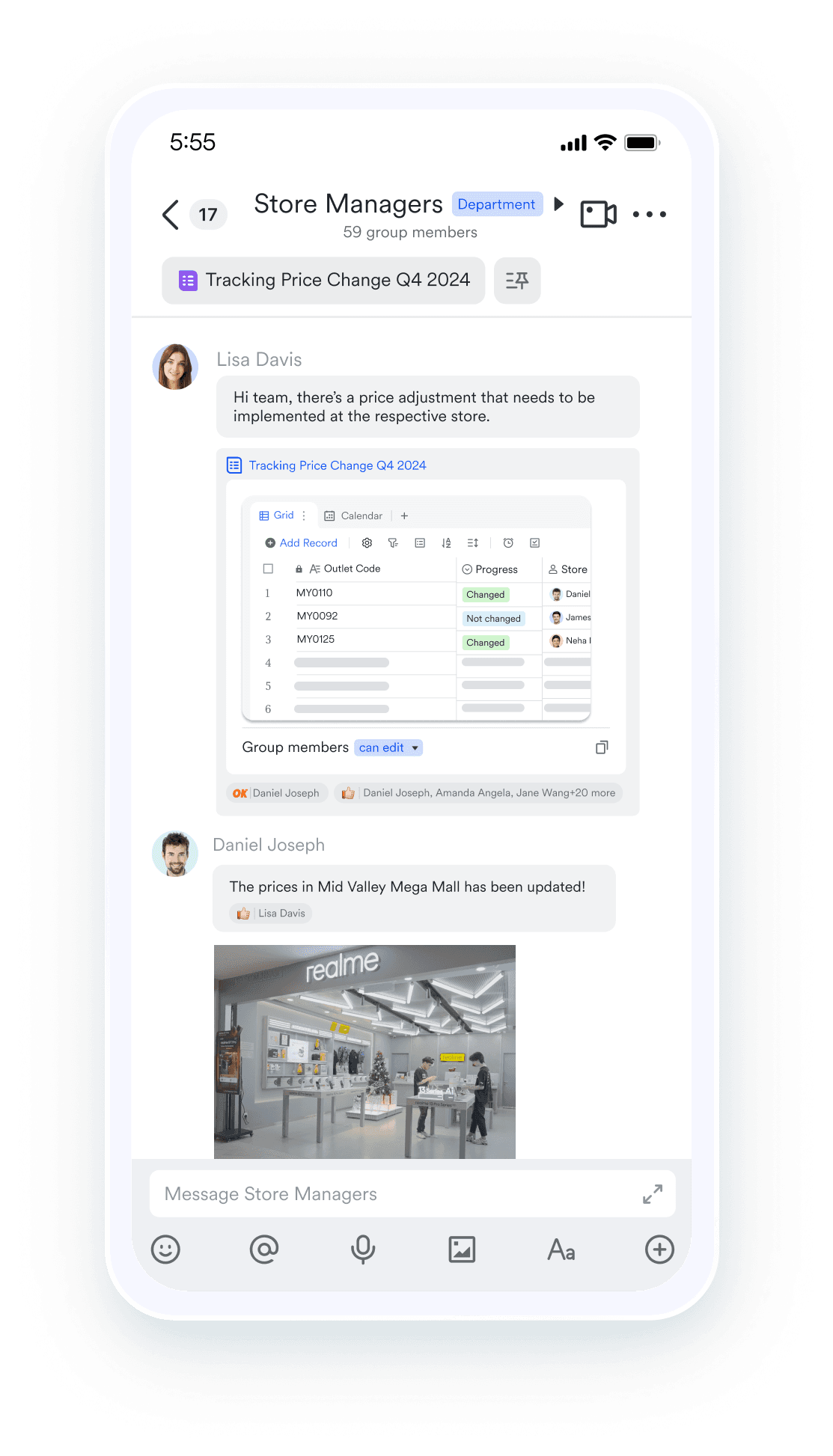A perfect example? A last-minute price change notification at 5:55 PM, just five minutes before HQ closed. Ben, realme Malaysia’s Brand Store Manager, sent the update to his stores via Lark. Within minutes, all stores had received instructions, updated pricing, and uploaded proof—before the workday ended.