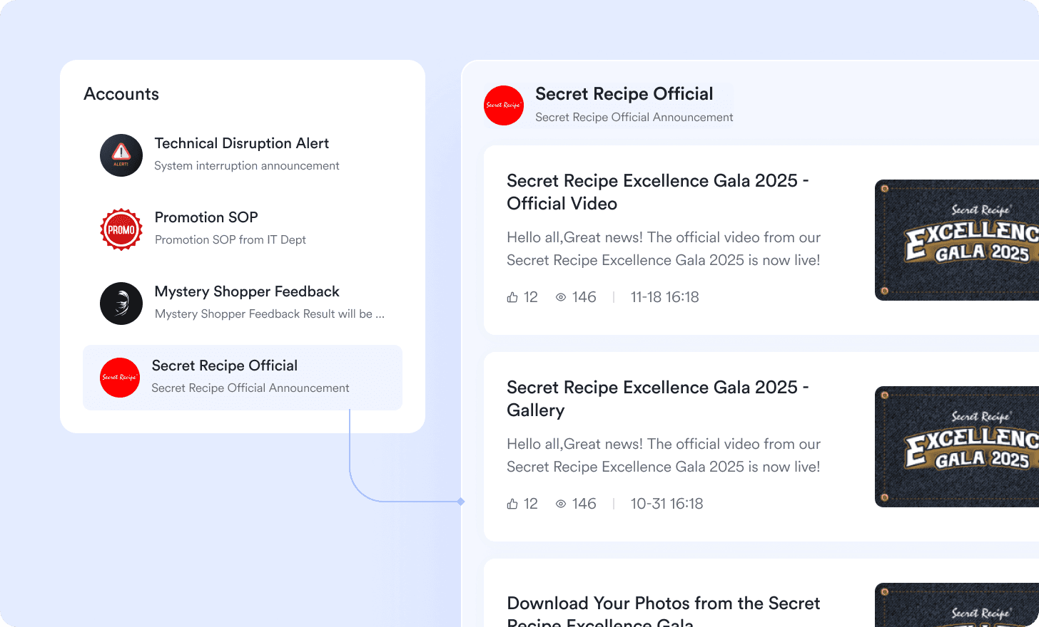 Previously, Secret Recipe shared announcements through group chats, but once messages were sent, they quickly disappeared into daily conversations. With constant chatter, leaders had no visibility into who had actually seen or read the information, and important memos were easily buried. New joiners struggled to locate past updates, which made onboarding slower and led to inconsistencies across stores.