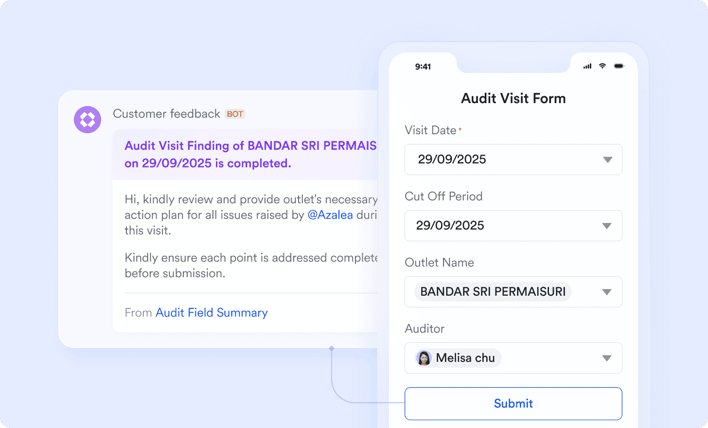 Audit forms are digitized using Lark Base + Forms — completed directly on mobile.
