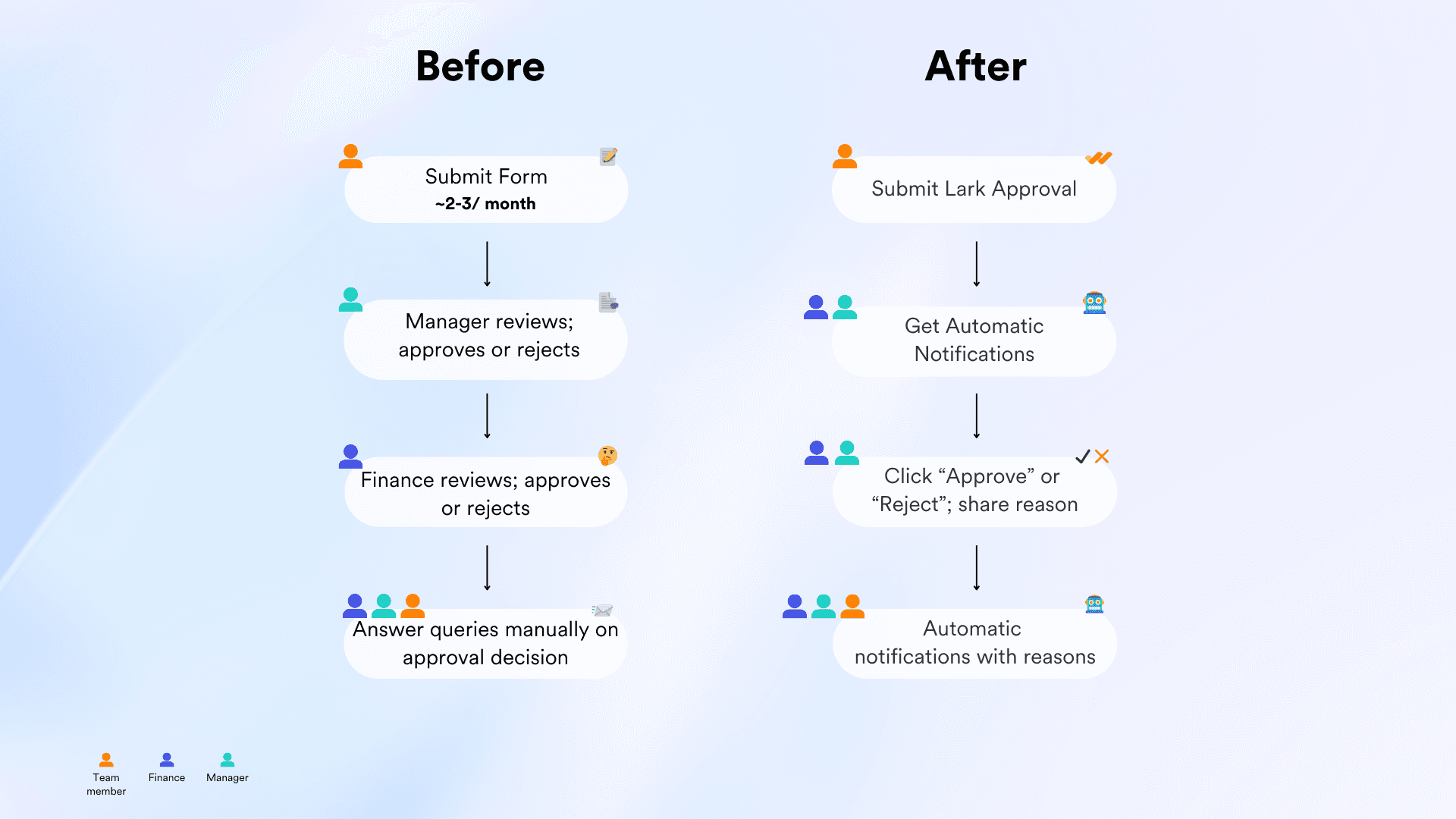Solution: Lark Approvals streamlined this process with automated workflows and real-time notifications. Approvers have to spend no more than a minute to read and decide. This new approach not only saved time but also eliminated the need for additional software, boosting morale.