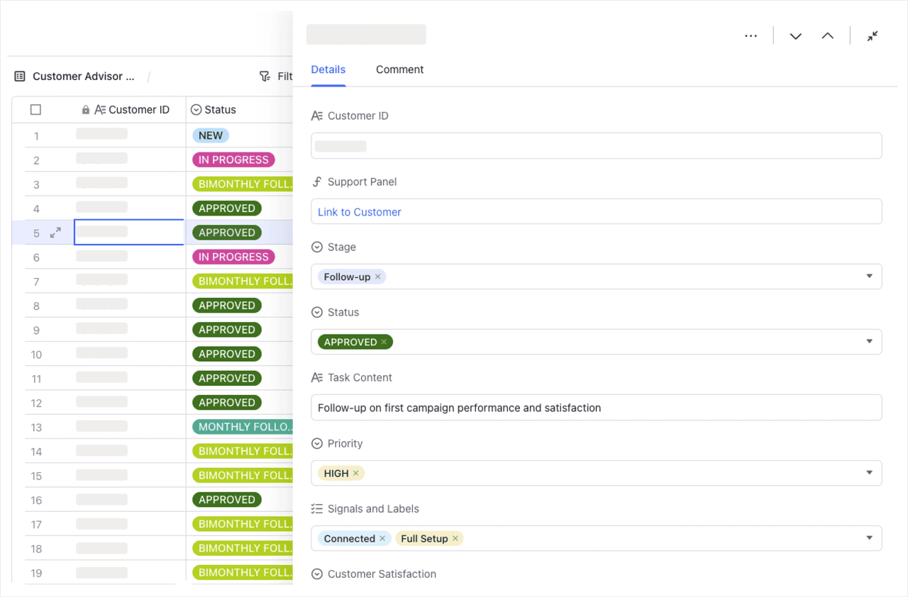 Better ways to focus on a book of business: Both the advisors and their managers on the customer success team sought more flexibility in browsing and analyzing customer portfolios without distracting the team with countless views. They needed a solution that would allow them to focus on their own customers while being able to update client status centrally.