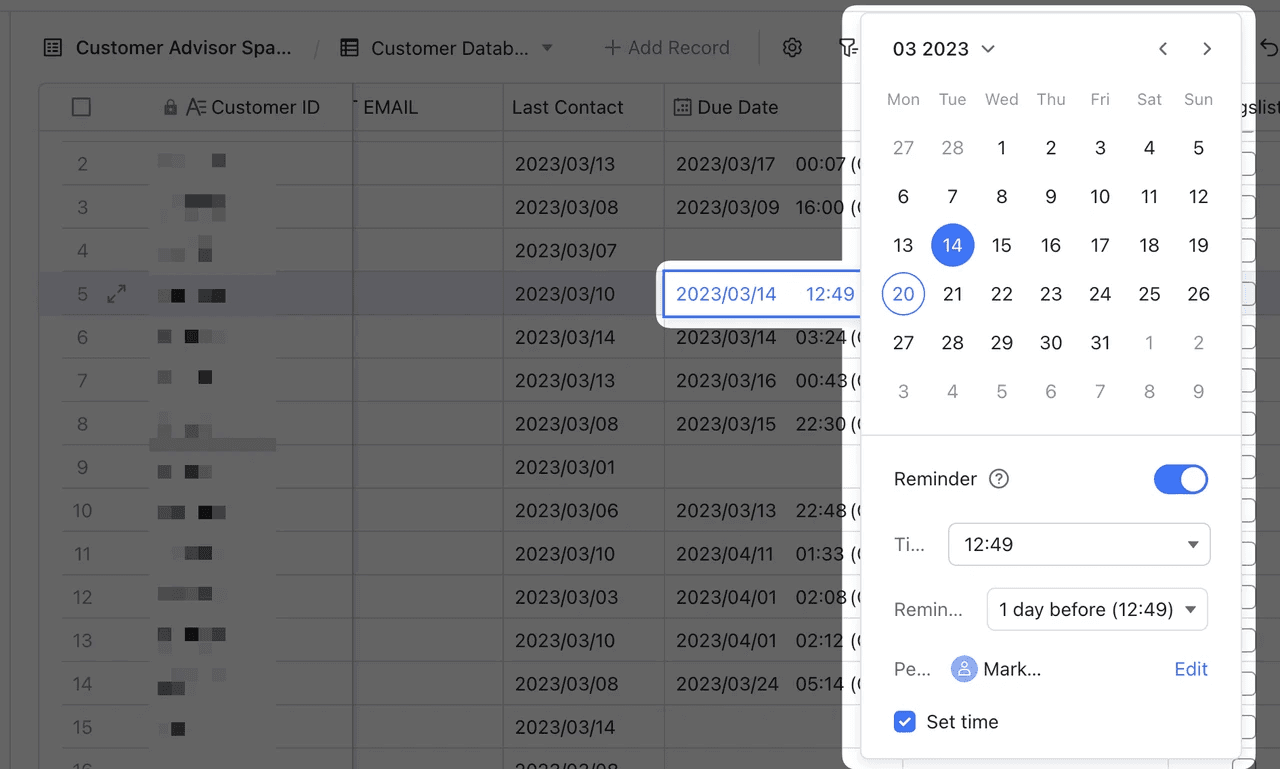 In addition, the customer success team boosts punctuality by turning on reminders for key dates in a few clicks, so that they can follow up with customers on their status on time upon receiving the reminder through Lark's Messenger.