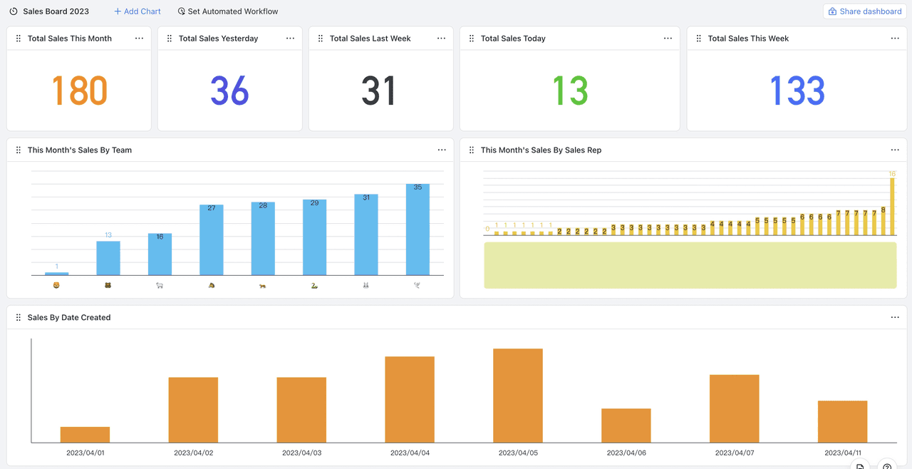 The sales team can conveniently submit new deals through the form view in Lark Base, whether in the office or on the go. The automated workflow will also calculate commissions based on deal type and promotions, returning a real-time total for sales leaders to refer to. With sales data centralized, each leader in the team can easily track their group's performance separately. They can also compare progress across different groups to identify areas for improvement. This allows the team to continuously optimize their sales strategy and drive better results.
