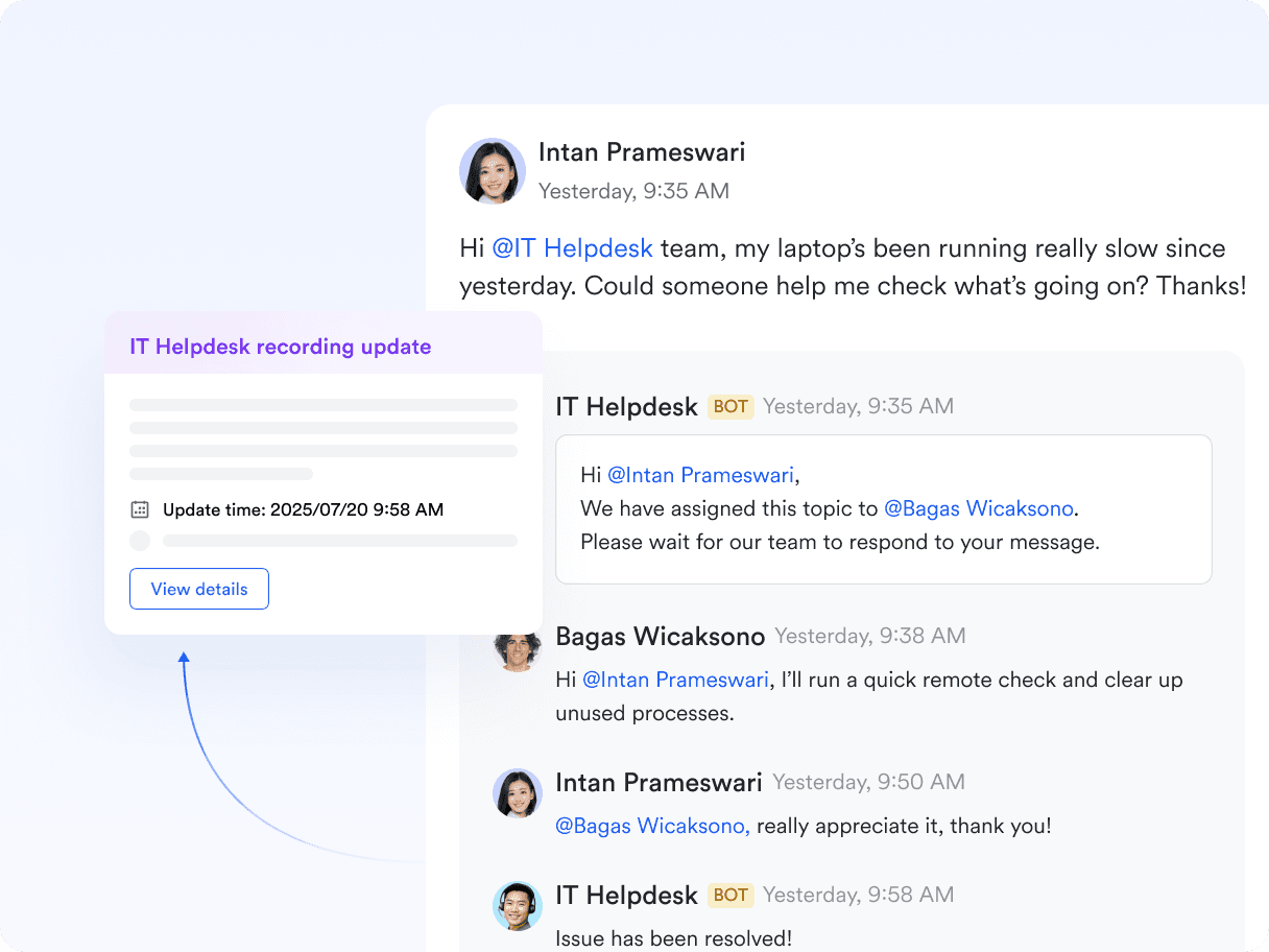 To improve task tracking and ticket management, GoTo deployed a chatbot built on Lark Agent, integrated with Lark Approval and Lark Base. Users can trigger requests directly from group chats, without switching platforms.