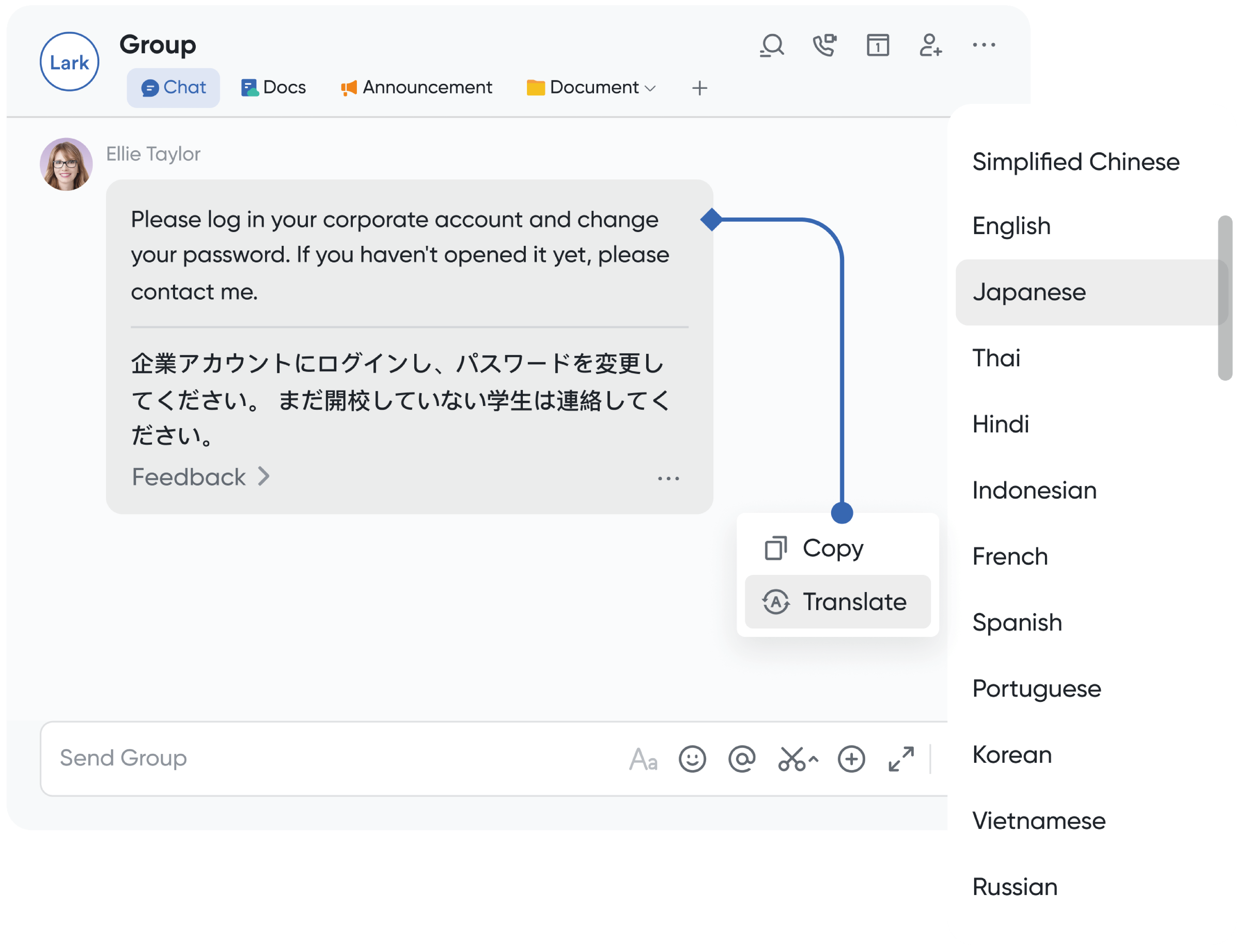Thanks to Lark's auto-translation, every chat, doc and meeting can be instantly translated into their native languages with one click. This also enables colleagues from different cultural backgrounds to express themselves confidently, creating a sense of participation and belonging.