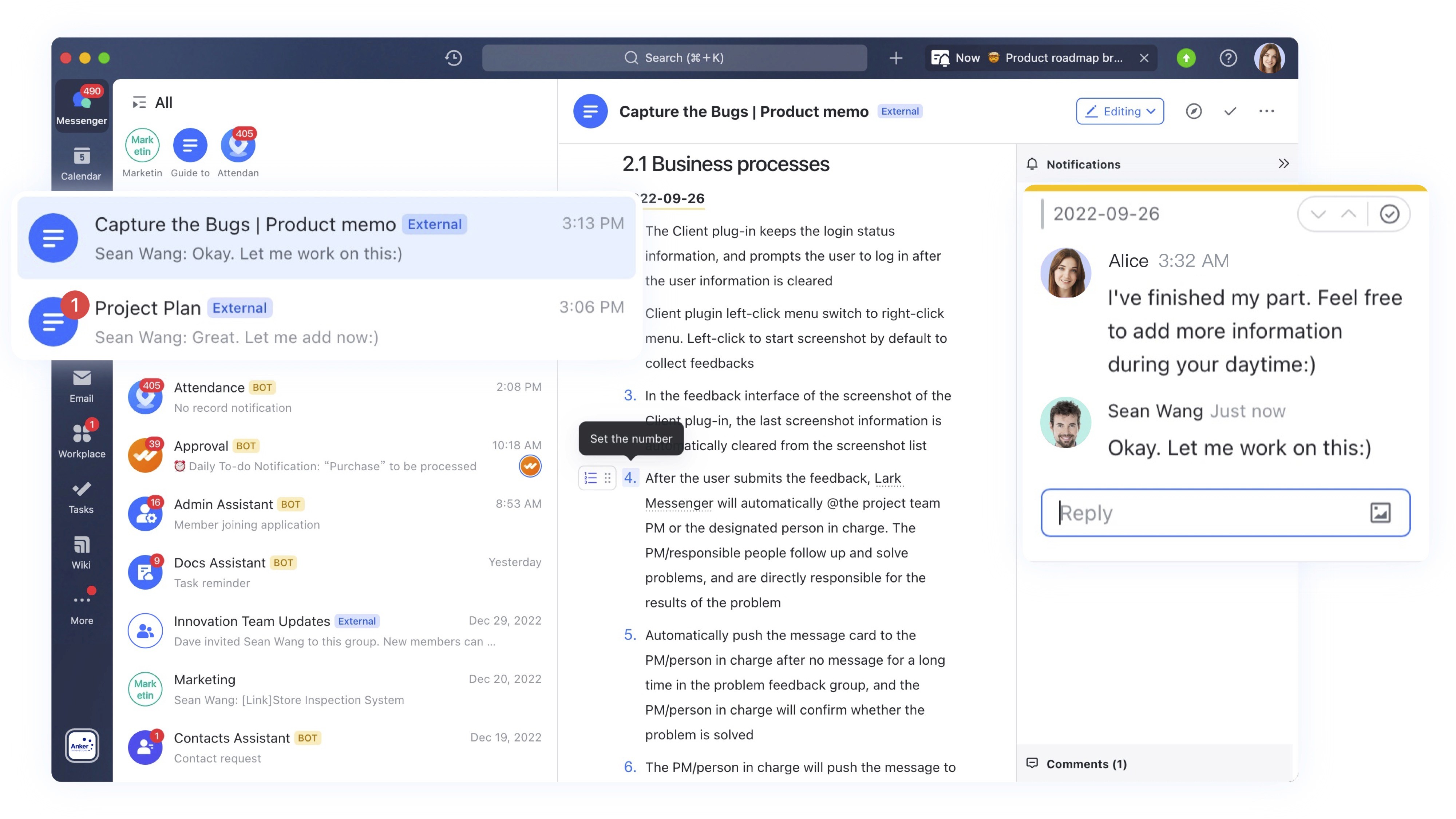 Therefore, employees must take advantage of asynchronous communication, which is made possible by Lark. For example, employees in the US organize their ideas into a Lark Doc during the day. The next day after they wake up, they will receive numerous comments from their colleagues in Europe in the doc. In this way, collaboration can be seamlessly passed on from one region to the next, like a relay race, and Lark is their perfect relay baton.