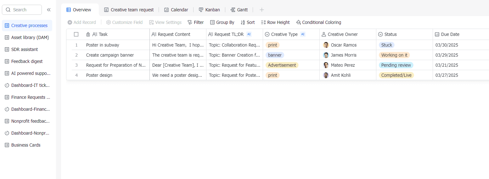 Lark Base AI is a comprehensive solution designed to streamline and optimize your creative processes. It includes an asset library, SDR assistant, AI-powered support, and various dashboards for IT, finance, and nonprofit feedback. It also features a business card creator, a Kanban board, and a Gantt chart for project management. The template also includes a creative team request section and a calendar for task management.