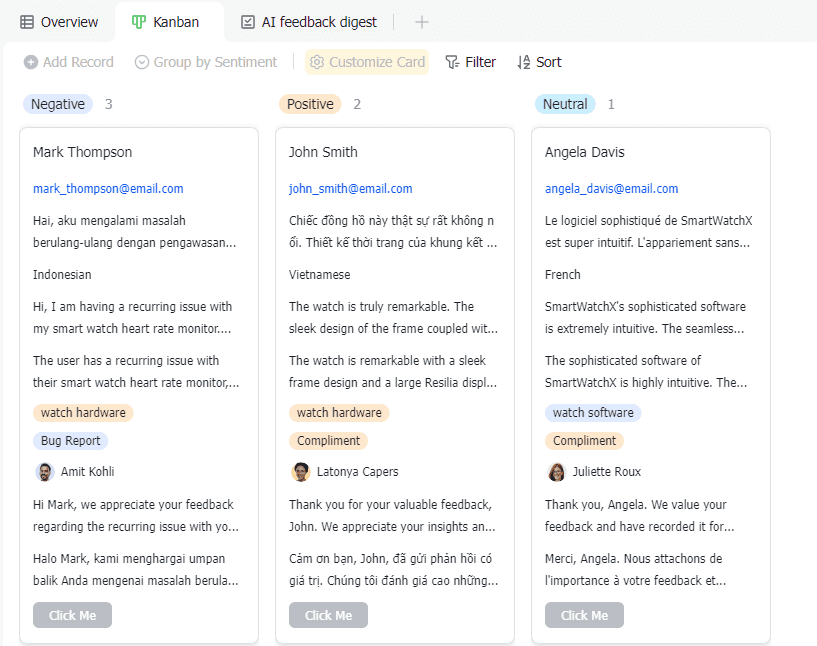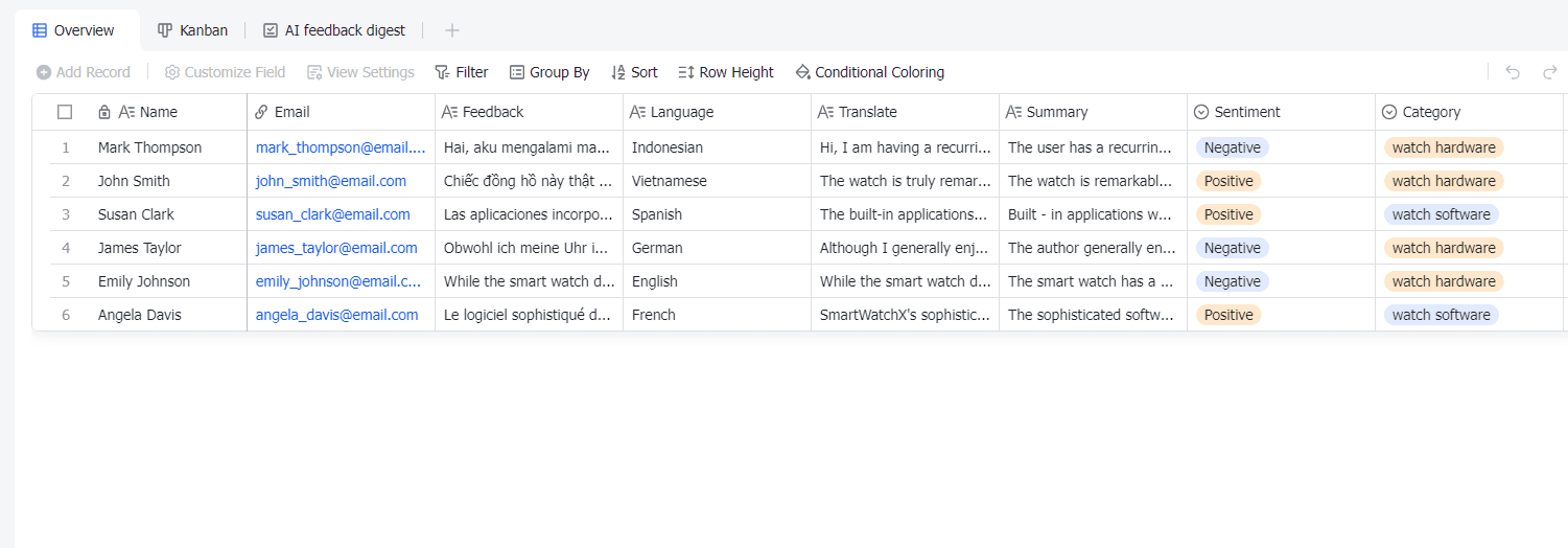 The Lark Base AI - Feedback Digest template is a comprehensive tool designed to collect, organize, and analyze feedback from various users. It includes fields for the user's name, email, original language of feedback, translated feedback, summary of feedback, sentiment (positive or negative), category (hardware or software), and type of feedback (complaint, bug report, or feature request). This template also provides a Kanban view for a visual representation of the feedback status and a search function for easy navigation.