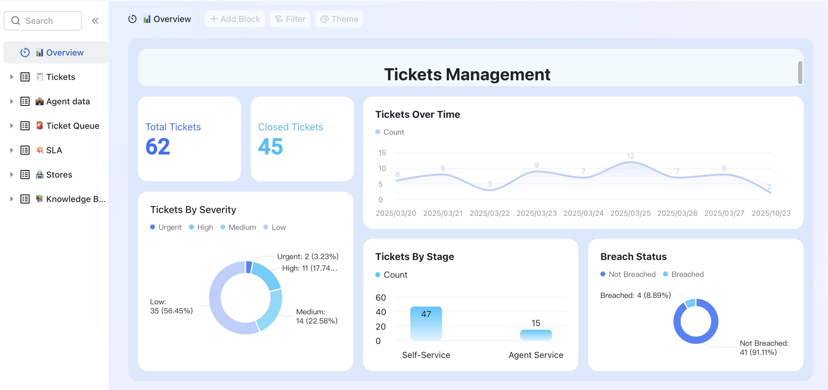 The AI-Powered Ticketing System template is designed to revolutionize how organizations manage customer support and internal service requests. By leveraging automation and intelligent workflows, this template enables teams to efficiently track, prioritize, and resolve tickets. It provides a centralized dashboard for ticket management, agent performance, SLA tracking, and severity analysis, ensuring that every request is handled with precision and speed. With built-in analytics, users can monitor ticket trends over time, breach status, and service channels, empowering teams to continuously improve their support processes.