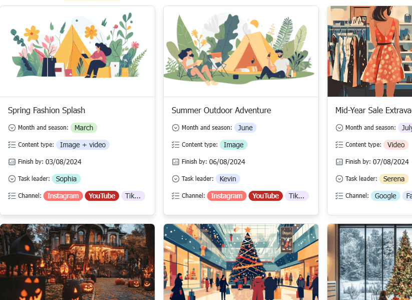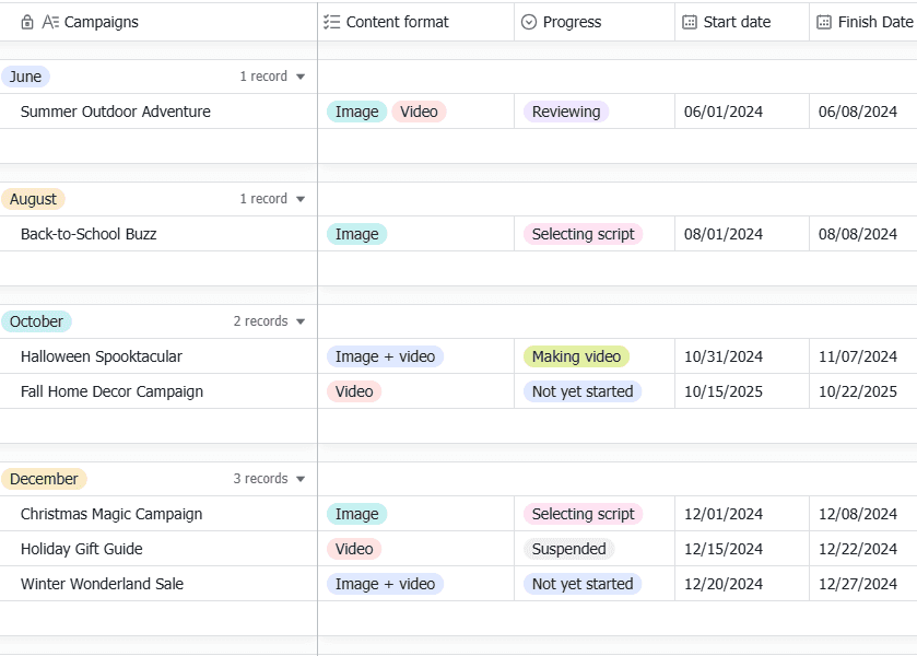 - Stay Organized: With fields for campaign names, content format, progress, and associated events, you can keep all your content details in one place.