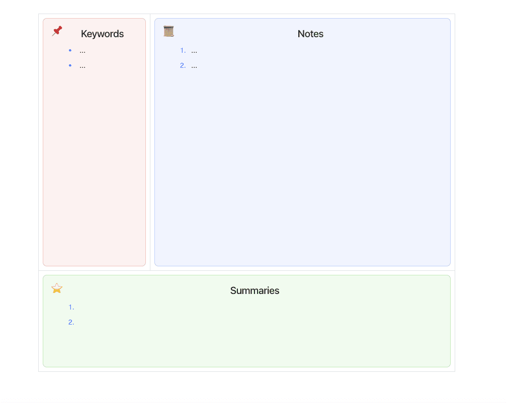 The Cornell Notes System, invented by Walter Pauk, a professor at Cornell University, is a proven and efficient learning method used in various industries. It divides notes into three columns: notes, keywords, and summaries, allowing for efficient recording and easy review and consolidation of knowledge. This template provides a structured format to implement the Cornell Notes System for your learning needs.