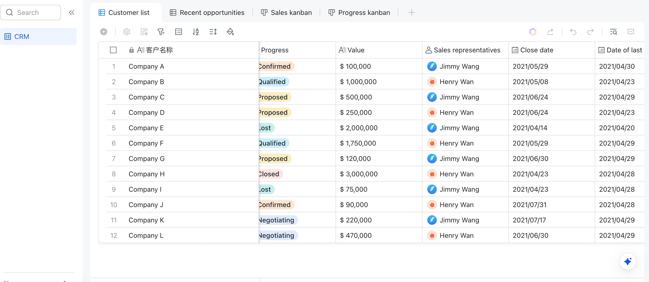 This CRM template is a comprehensive tool for managing your customer relationships and tracking sales opportunities. It includes a customer list, recent opportunities, sales kanban, and progress kanban. Each entry includes the customer name, progress status, value, sales representative, and close date. This template is designed to help you keep track of your sales pipeline and ensure that no opportunity slips through the cracks.