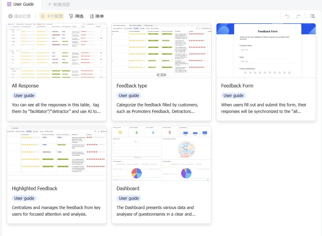 The Customer Satisfaction Form and Analysis template is a comprehensive tool designed to streamline the process of collecting, categorizing, and analyzing customer feedback. It includes features for creating new views, adding records, configuring cards, filtering, and sorting. The template also provides a user guide for each feature, ensuring you can maximize its potential. It allows you to see all responses in one place, tag them by 'facilitator' or 'detractor', and even use AI for further analysis. Feedback can be categorized for easier management and analysis, and key user feedback can be centralized for focused attention.