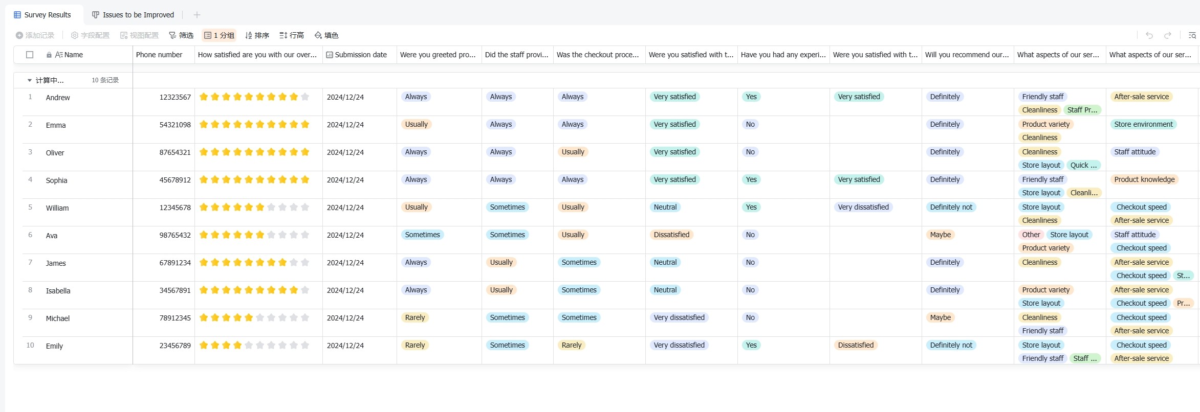 The Customer Service Survey template is a comprehensive tool designed to collect and analyze feedback from customers about their experiences with your customer service. It includes fields for customer name, phone number, satisfaction level, submission date, and specific questions about their interaction with your staff. This template is designed to help you identify areas of improvement and ensure your customers are receiving the best possible service.