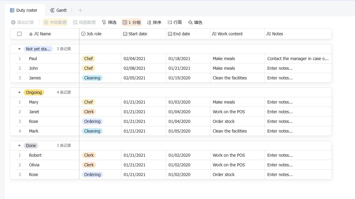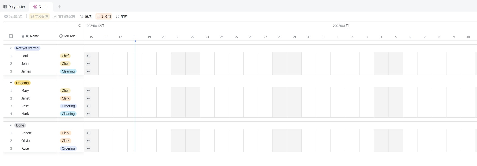 The Duty Roster template is a powerful tool for managing your team's schedule. It allows you to assign roles, start dates, and track the progress of each task. The template is designed in a Gantt chart format, providing a visual representation of your team's workload and schedule. It's easy to add records, configure fields, and filter and sort data to suit your needs. The Duty Roster template is an essential tool for any team leader or manager who wants to ensure their team is working efficiently and effectively.