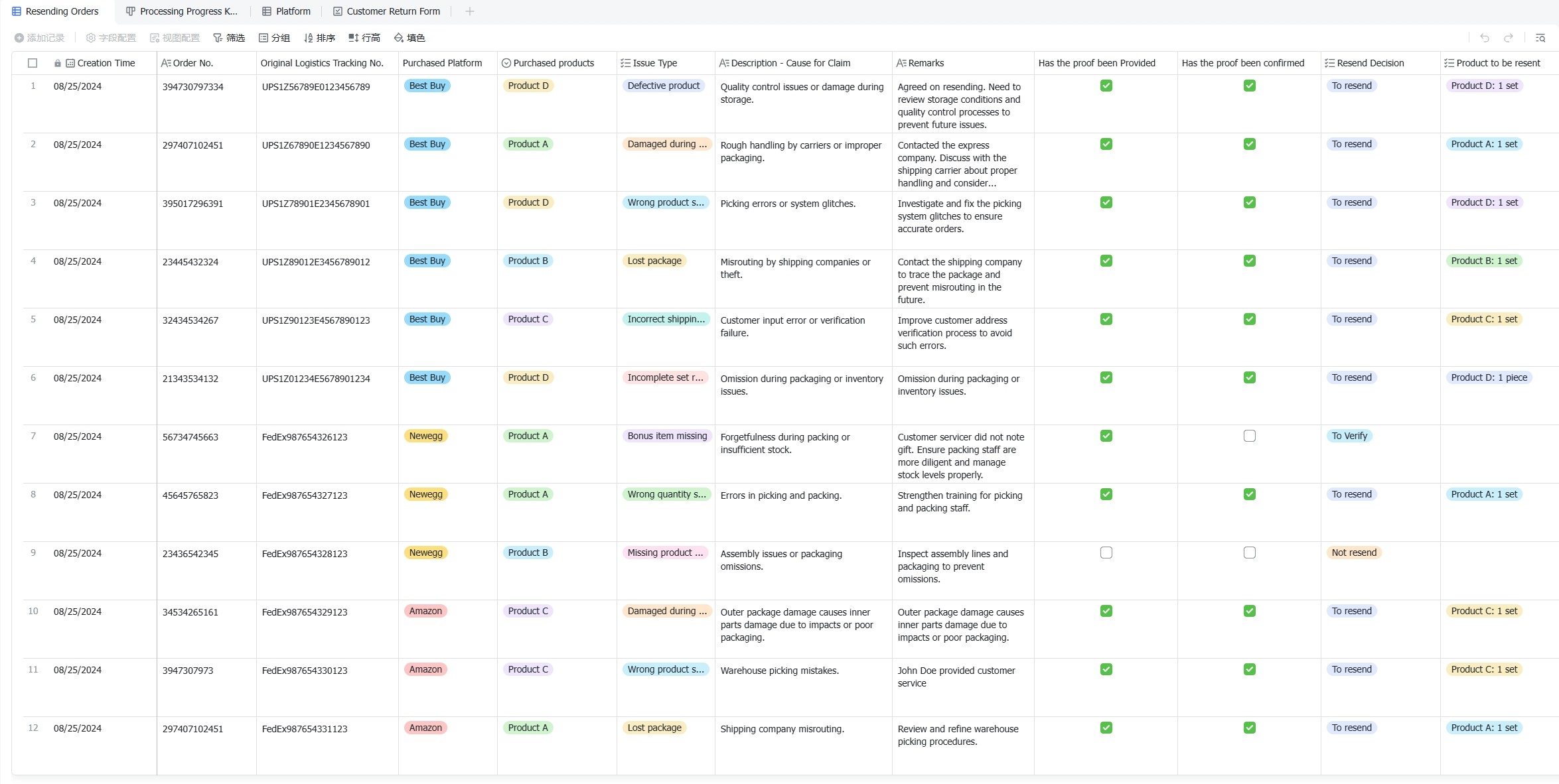 This template is designed to help e-commerce businesses manage their after-sales processes more effectively. It includes features for tracking resending orders, processing refunds, and handling medium and negative comments. The template provides a structured way to record and monitor all after-sales activities, including the creation time, order number, original logistics tracking number, purchased platform, purchased products, issue type, and description. This allows businesses to keep a close eye on their after-sales performance and make necessary adjustments to improve customer satisfaction.
