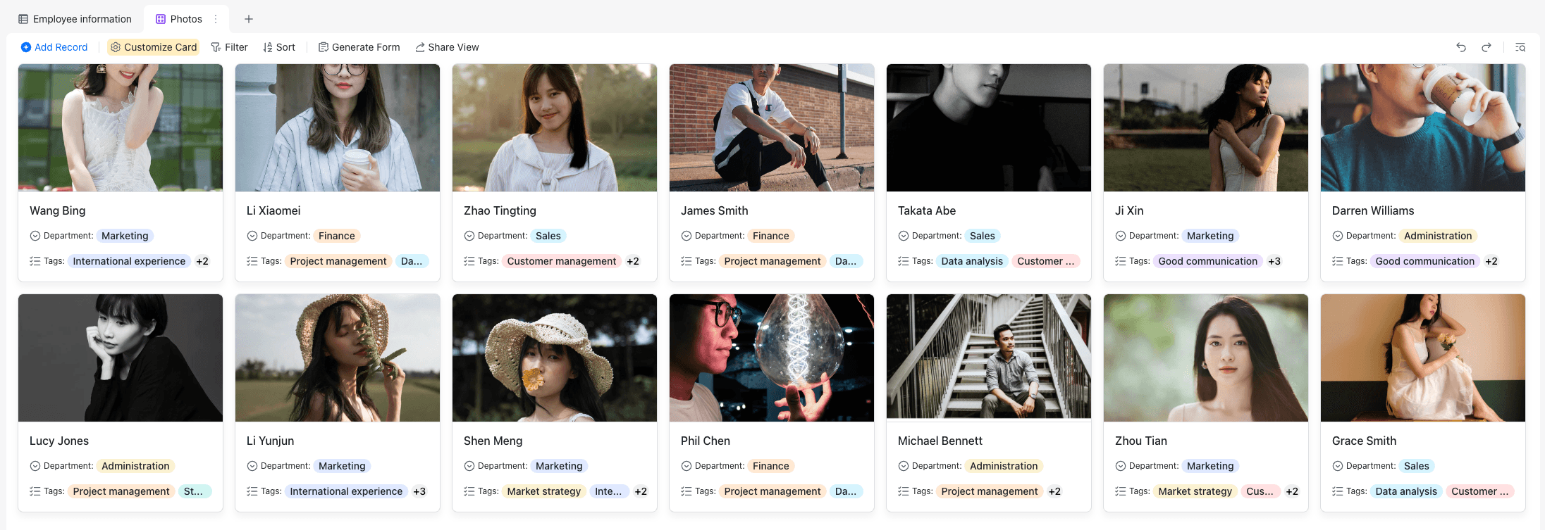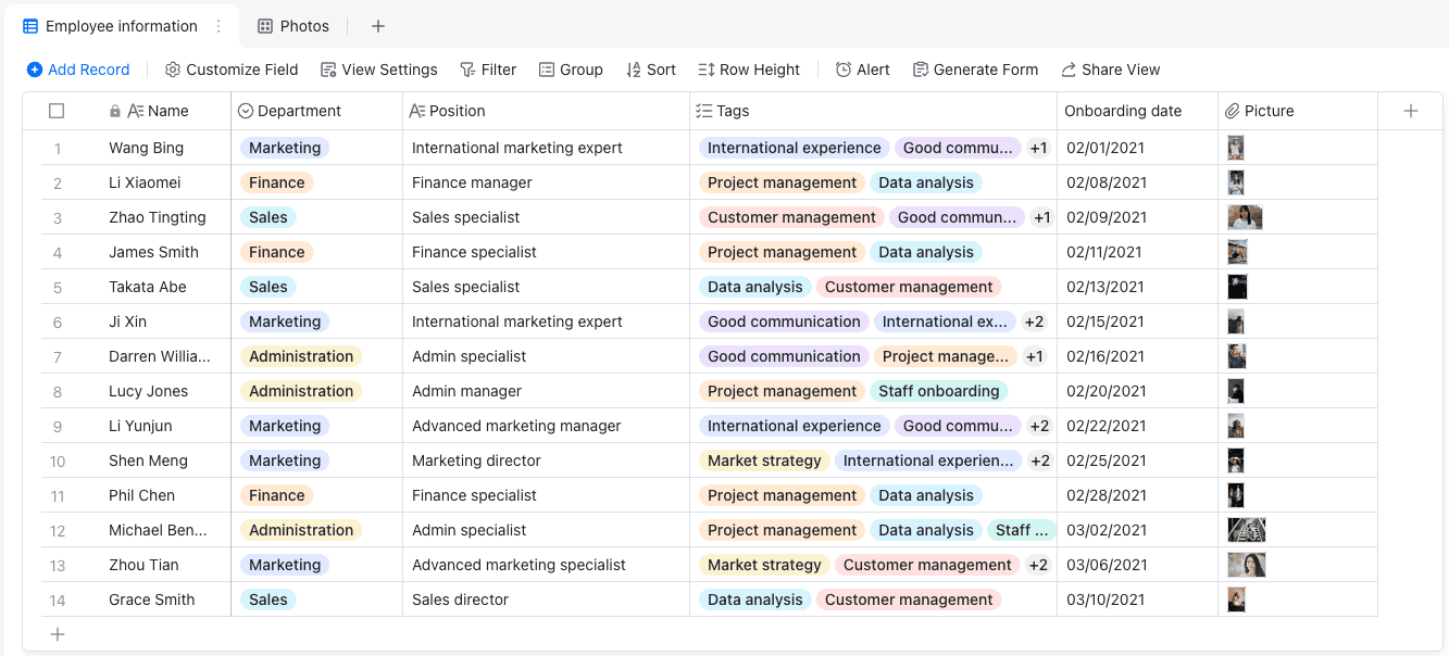 Keeping track of employee information is crucial for any organization. This template allows you to efficiently manage and organize employee information such as name, department, position, tags, onboarding date, and picture. With Lark's user-friendly interface, you can easily update and access employee information whenever needed, ensuring that your team stays informed and connected.