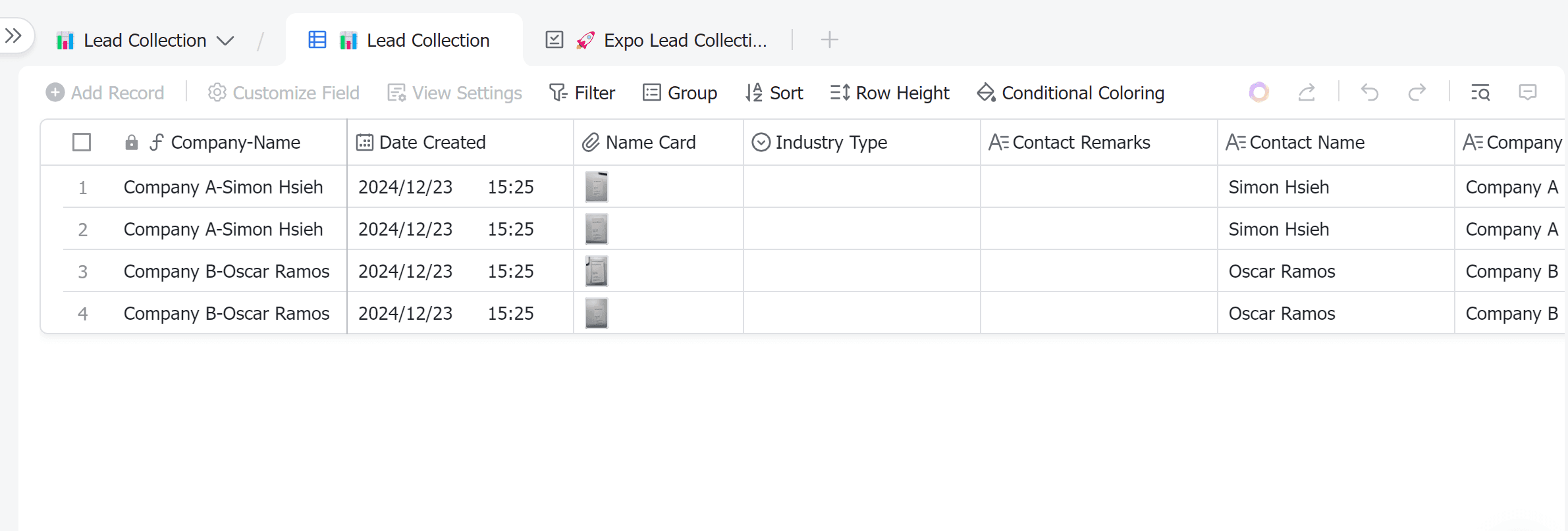 Expos and trade shows are a goldmine for generating leads. However, managing these leads can be a daunting task. That's where our Expo Lead Collection template comes in. It is designed to help you efficiently collect and manage leads from expos. The template includes fields for company name, date created, name card, industry type, AE contact remarks, and AE contact number. This way, you can keep track of all the important details about your leads in one place.