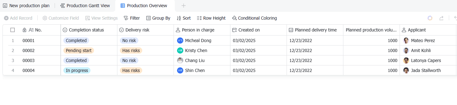 The Garment Inventory Management System template is a comprehensive tool designed to help you manage your garment inventory. It includes features such as an inventory list, new inbound products, and detailed product information including product number, size, category, unit price, warehouse location, initial inventory, and purchase quantity. The template also allows you to add records, customize fields, adjust view settings, apply filters, group by specific parameters, sort data, adjust row height, and apply conditional coloring.