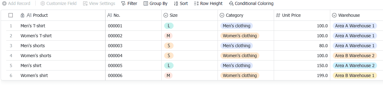 The Garment Inventory Management System template is a comprehensive tool designed to help you manage your garment inventory. It includes features such as an inventory list, new inbound products, and detailed product information including product number, size, category, unit price, warehouse location, initial inventory, and purchase quantity. The template also allows you to add records, customize fields, adjust view settings, apply filters, group by specific parameters, sort data, adjust row height, and apply conditional coloring.