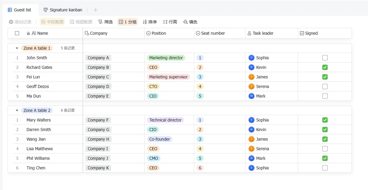 Managing a guest list can be a daunting task, especially when dealing with a large number of guests from different companies. This template is designed to help you keep track of all your guests, their companies, and any special tags or notes associated with them. It allows you to add new records, configure fields, and filter or group data as needed. This way, you can easily manage your guest list, ensuring that no one is overlooked and everyone is properly accounted for.