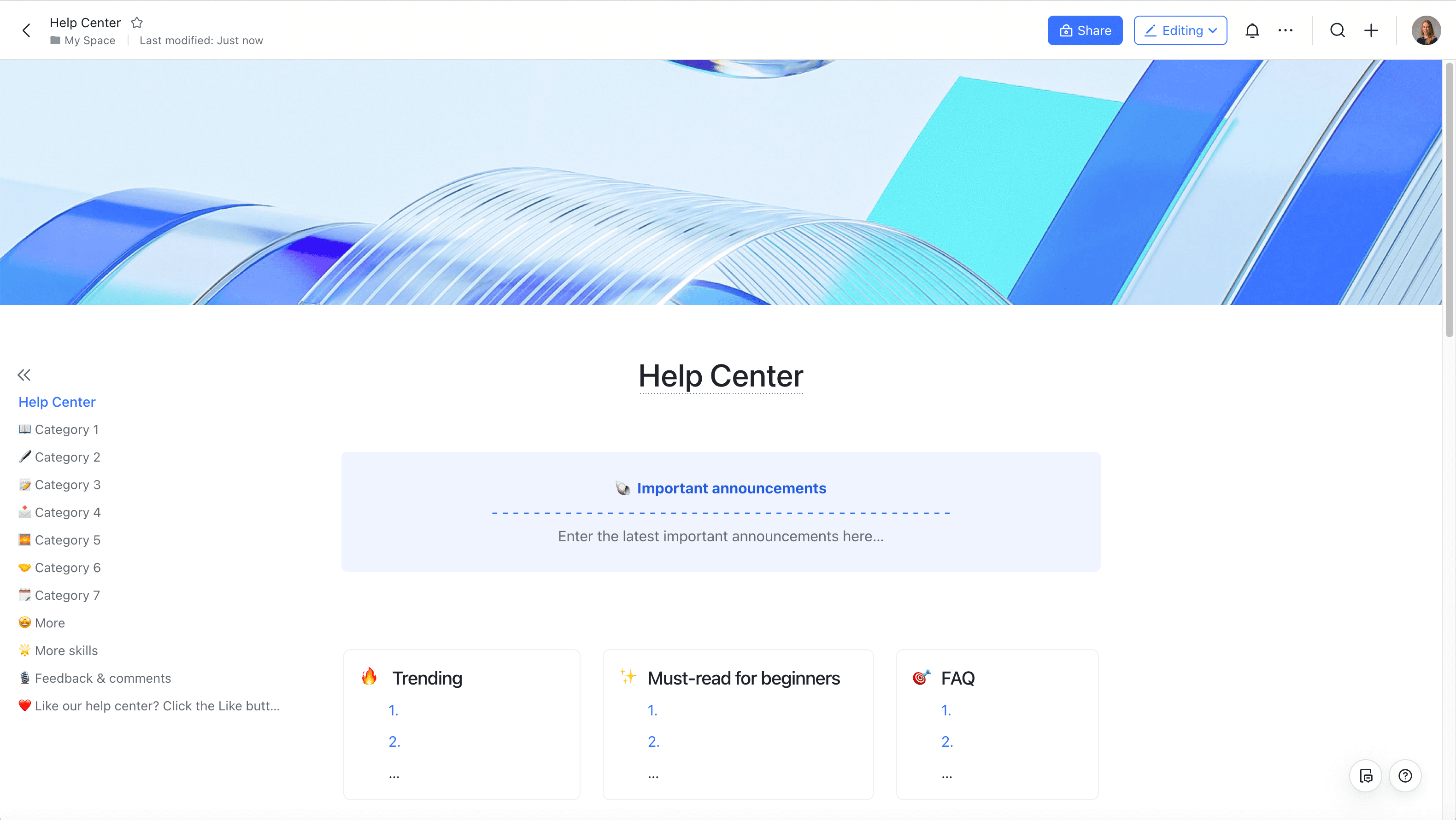 A help center is a centralized hub where users can find answers to their questions, access important announcements, and discover new features. This help center template is designed to help you organize your content in a clear and concise manner, making it easy for users to find the information they need. With categories for announcements, trending topics, beginner guides, FAQs, and more, this template ensures that your help center is always up-to-date and user-friendly.