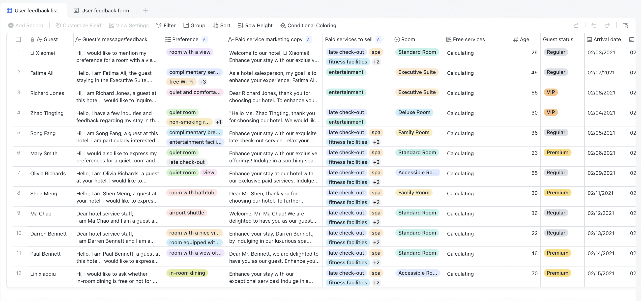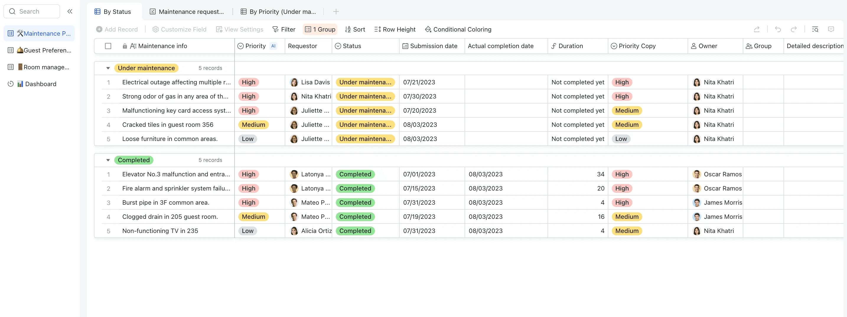This template is a comprehensive tool for managing hotel housekeeping tasks. It includes features for tracking guest feedback, maintenance requests, and room management. The template allows you to sort and filter data based on various parameters such as guest status, arrival date, and room preferences. It also includes a dashboard for a quick overview of the status of maintenance requests.
