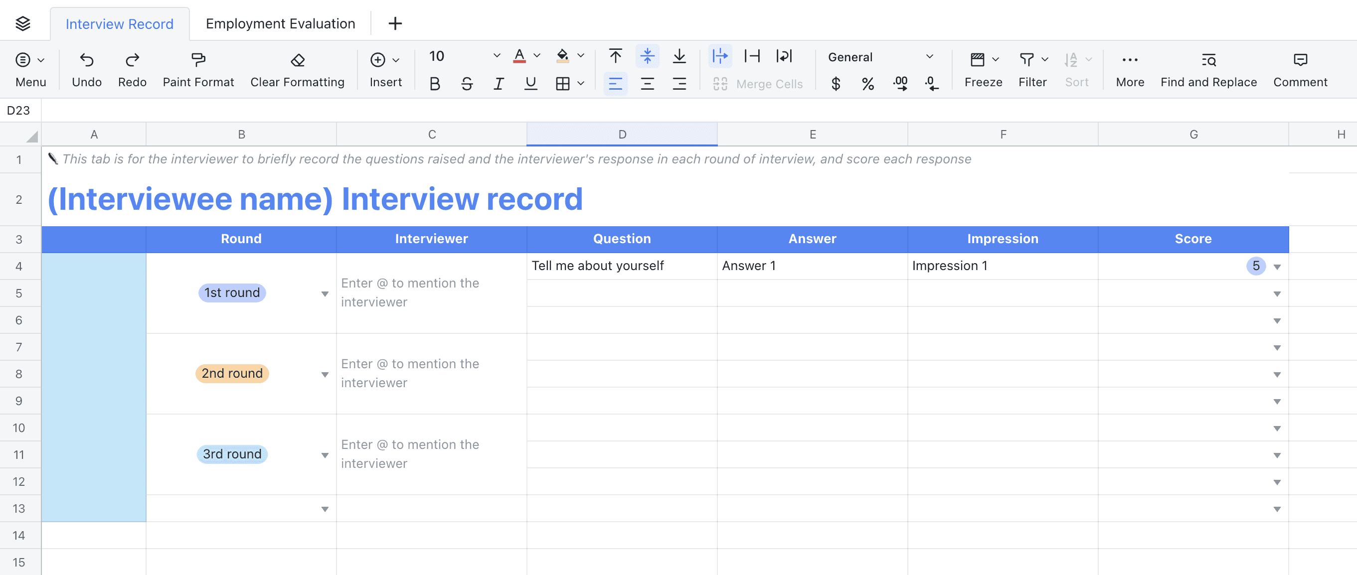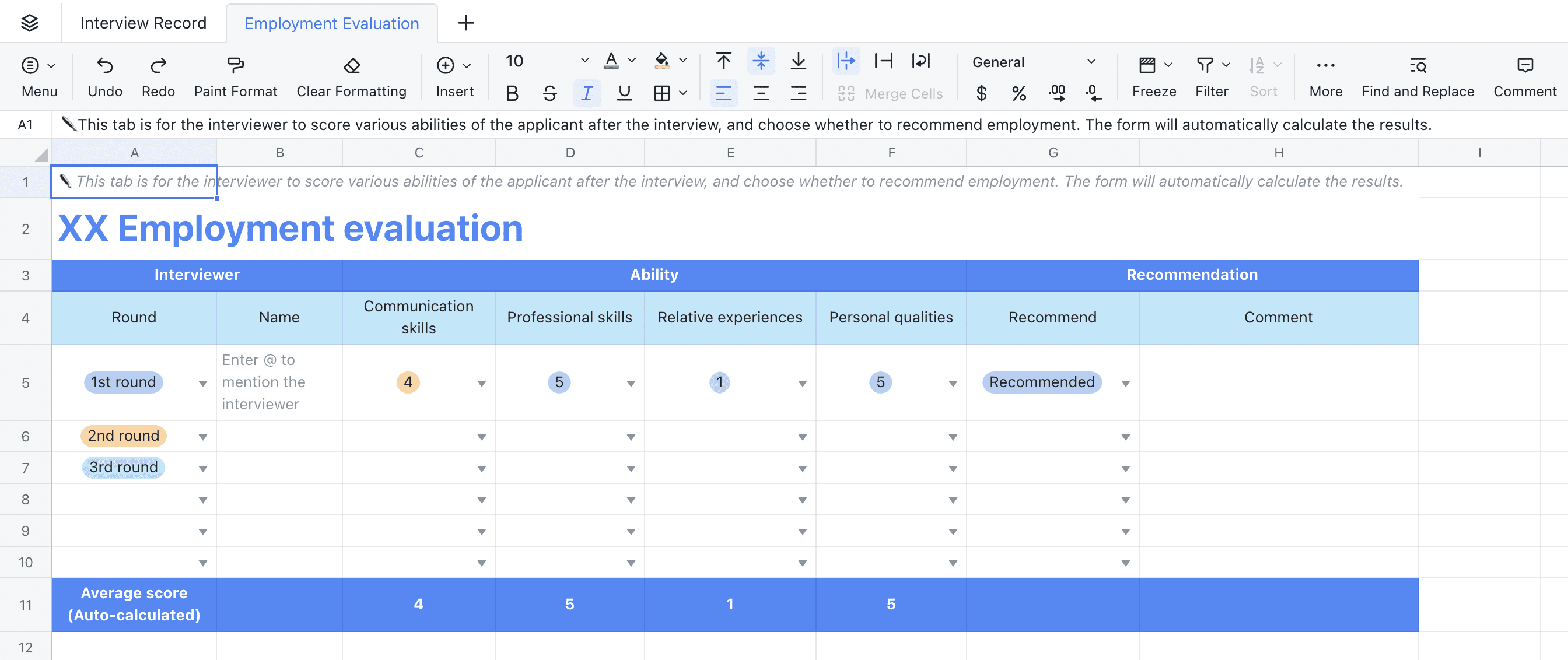 This template is designed to help interviewers record questions, answers, and impressions during each round of interviews. It also allows interviewers to score various abilities of the applicant after the interview and choose whether to recommend employment. The form will automatically calculate the results, making it easier to evaluate candidates and make informed hiring decisions.
