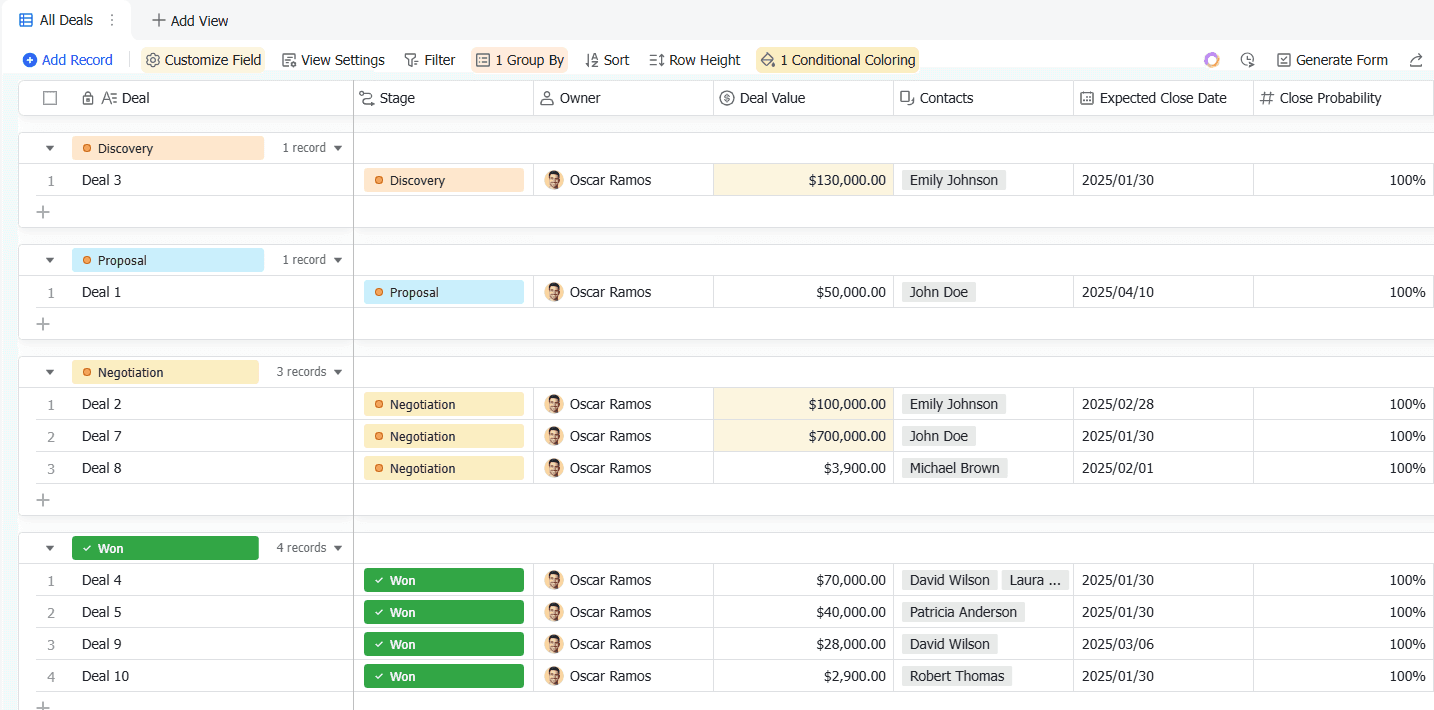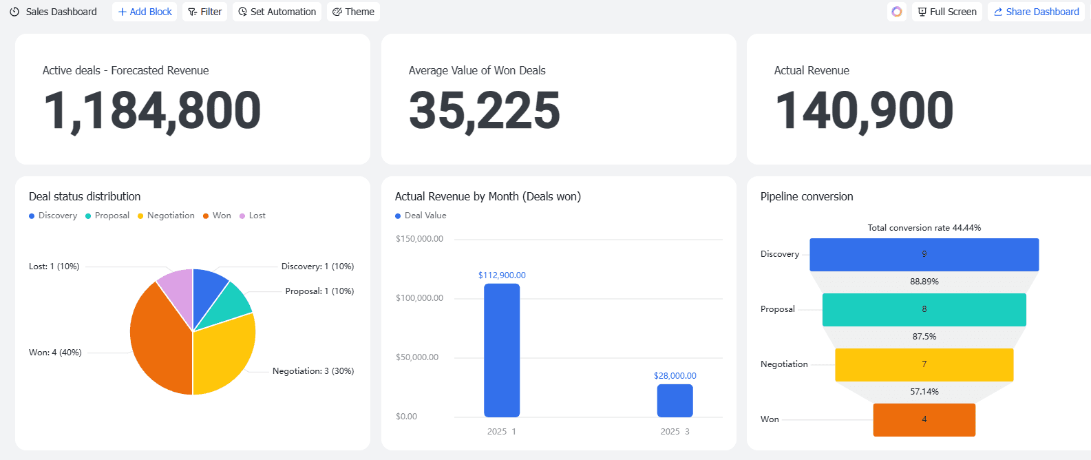 - Track Deal Status: The deal status distribution chart allows you to track the status of your deals at a glance.