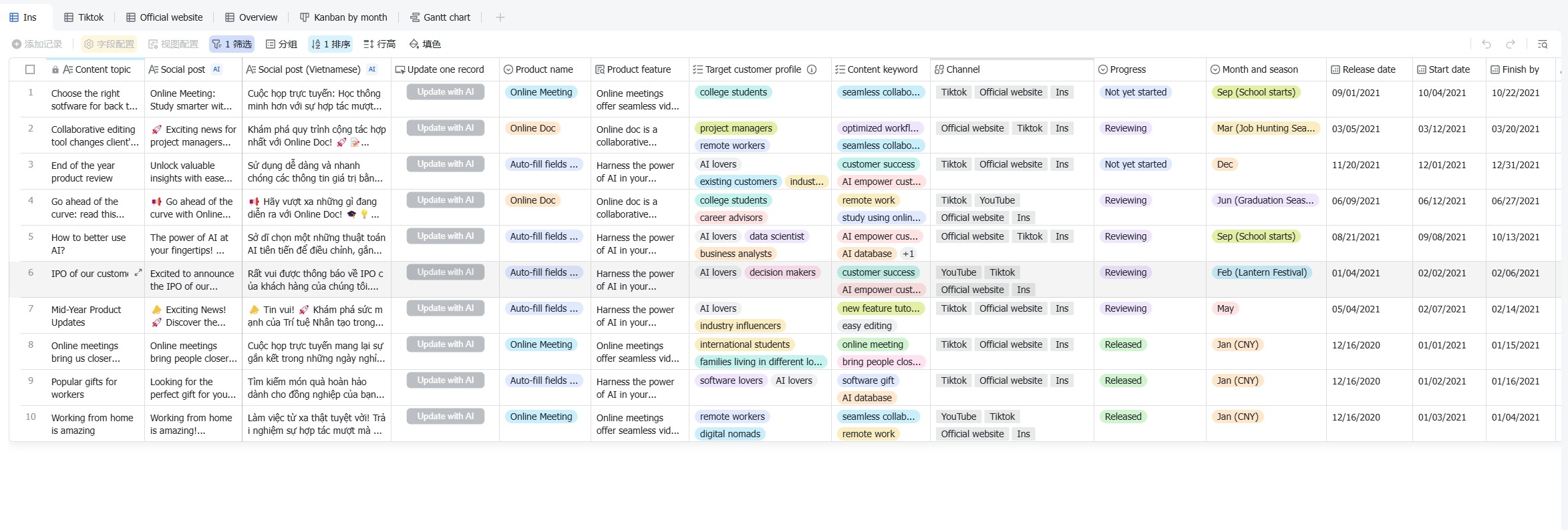This template is designed for marketing professionals, content creators, social media managers, and anyone who needs to plan and manage marketing content across multiple channels. Whether you're a freelancer managing multiple clients, a small business owner juggling various marketing tasks, or a marketing team in a large organization, this template can help you streamline your processes, save time, and make data - driven decisions. It's also beneficial for those who want to leverage AI in their marketing efforts, with features that auto - fill fields and summarize tasks