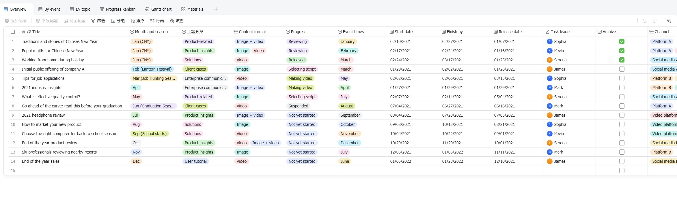This Marketing Content Calendar template is a comprehensive tool for planning, organizing, and tracking your marketing content throughout the year. It includes sections for the title, month and season, topic category, content format, progress, event times, start and finish dates, release dates, task leader, and the platform where the content will be published. It also provides a visual representation of the content's progress and timelines, making it easier to manage and coordinate marketing efforts.