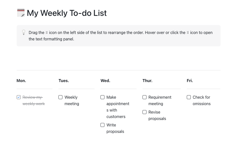 Enhanced collaboration: If you're working with a team, sharing your weekly to-do list can help ensure that everyone is on the same page and working towards the same goals.