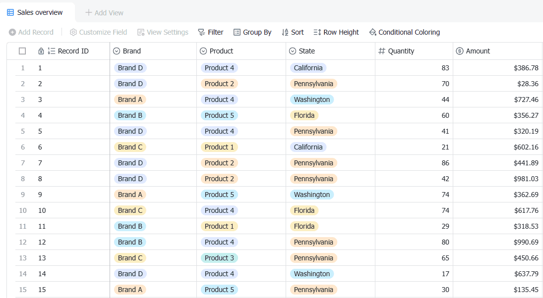The National Sales Data Dashboard is a comprehensive tool designed to help you track and analyze your sales data across different regions, products, and brands. It provides a clear overview of the quantity sold, the amount earned, and the date of sale for each product from each brand in different states. The dashboard also allows you to customize the view settings, filter the data, group by certain parameters, sort the records, and adjust the row height for a more personalized viewing experience.