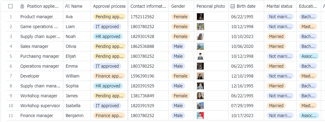 The New Hire Registration template is a comprehensive tool designed to simplify and streamline the process of onboarding new employees. It includes fields for all the essential information you need to collect from new hires, such as their name, contact information, position applied for, approval process status, personal photo, birth date, marital status, education, address, ID, and gender. It also includes a variety of views, such as a master sheet, a gender breakdown, an employee photo gallery, an approval kanban, a start date calendar, and more. This template is customizable, allowing you to add records, customize fields, adjust view settings, and even generate a form for new hires to fill out.