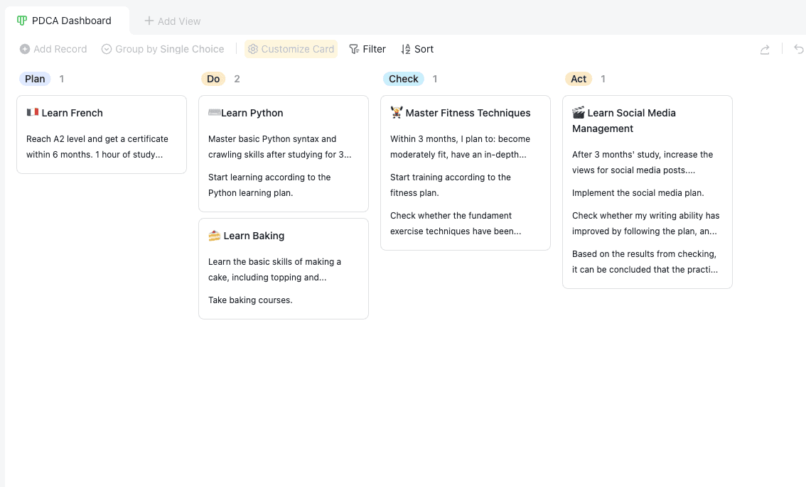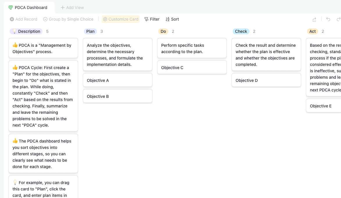 The Objective Management PDCA Kanban is a dynamic tool designed to streamline the process of managing objectives. The PDCA (Plan-Do-Check-Act) cycle is a proven method for achieving objectives and continuous improvement. This template allows you to create a plan for your objectives, execute the plan, constantly check the progress, and act based on the results from checking. It helps you to analyze the objectives, determine the necessary processes, and formulate the implementation details. The PDCA dashboard helps you sort objectives into different stages, so you can clearly see what needs to be done for each stage.