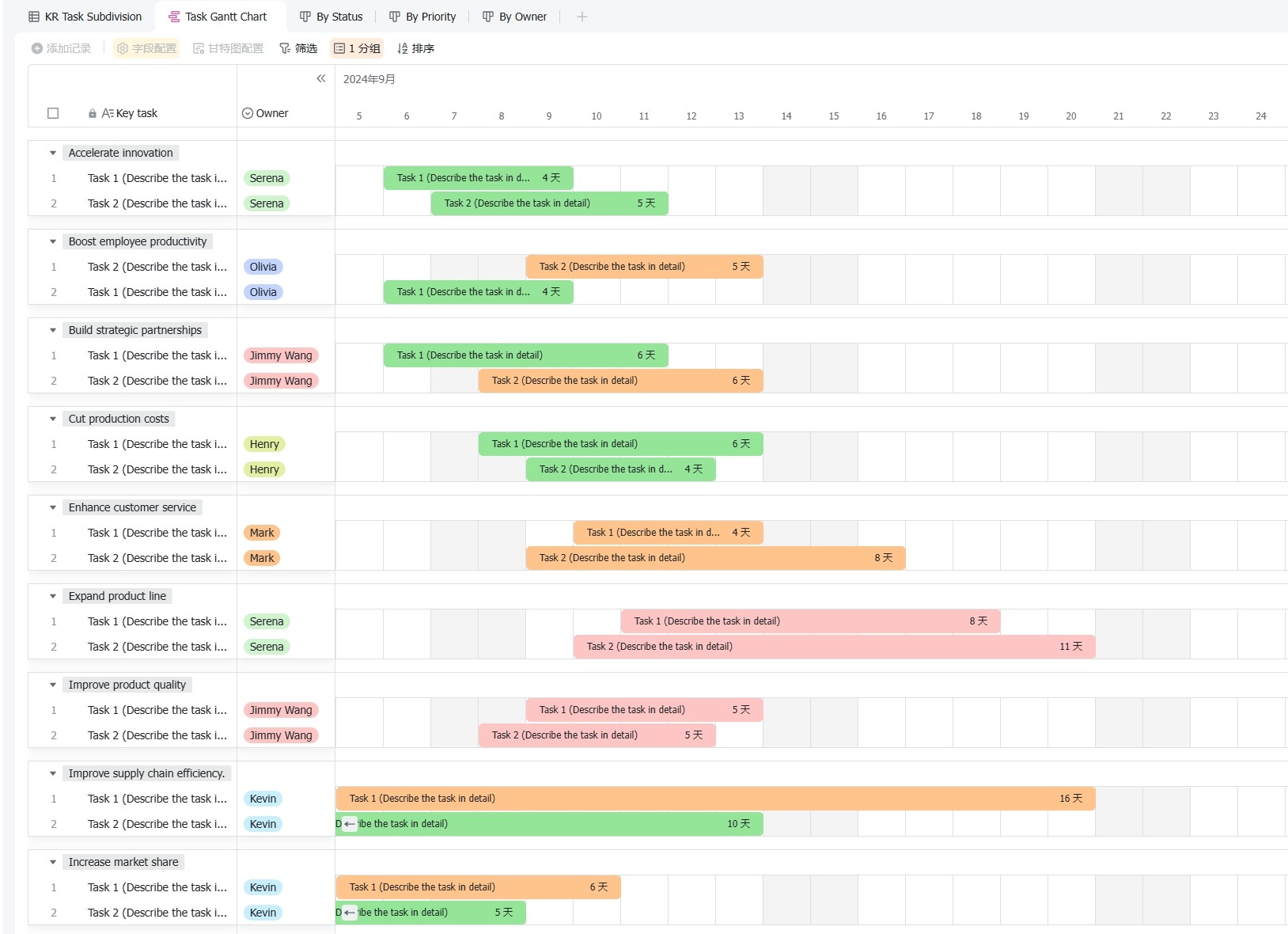 The OKR Task Subdivision and Progress Control template is a comprehensive tool designed to help you manage and track your Objectives and Key Results (OKRs) tasks. It provides a detailed Gantt chart view of your tasks, allowing you to visualize your project timeline and monitor the progress of each task. The template also allows you to filter and sort tasks by status, priority, and owner, making it easier to prioritize and delegate tasks.