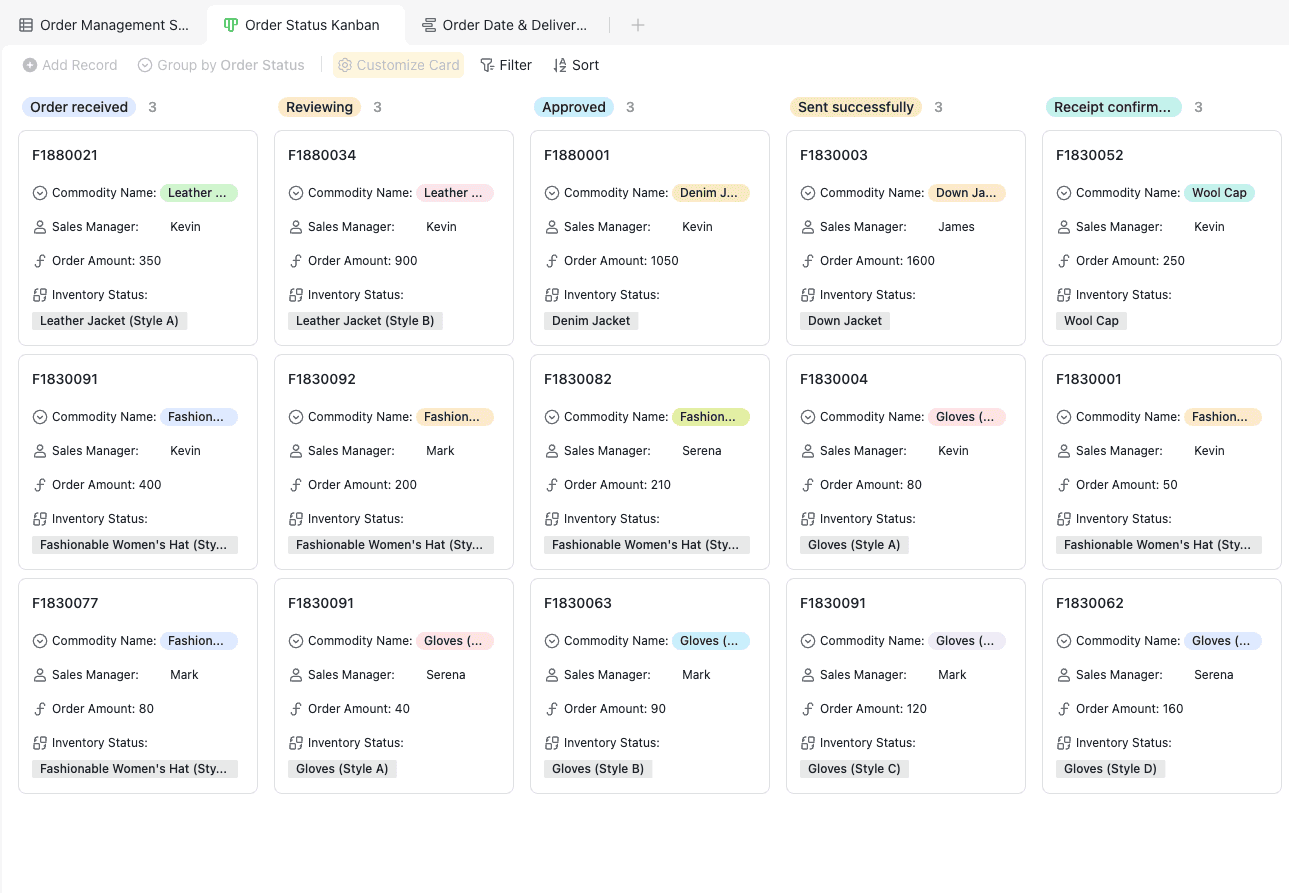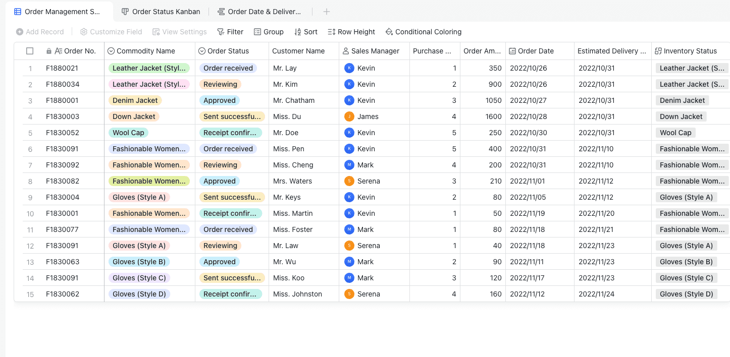 Managing orders and inventory can be a daunting task, especially when dealing with a large number of products and customers. This template is designed to simplify the process by providing a comprehensive overview of all orders and their respective statuses, along with the inventory status of each product. It includes fields for order number, commodity name, order status, customer name, sales manager, purchase date, order amount, and estimated delivery date. The template also features a Kanban view for a visual representation of the order statuses.