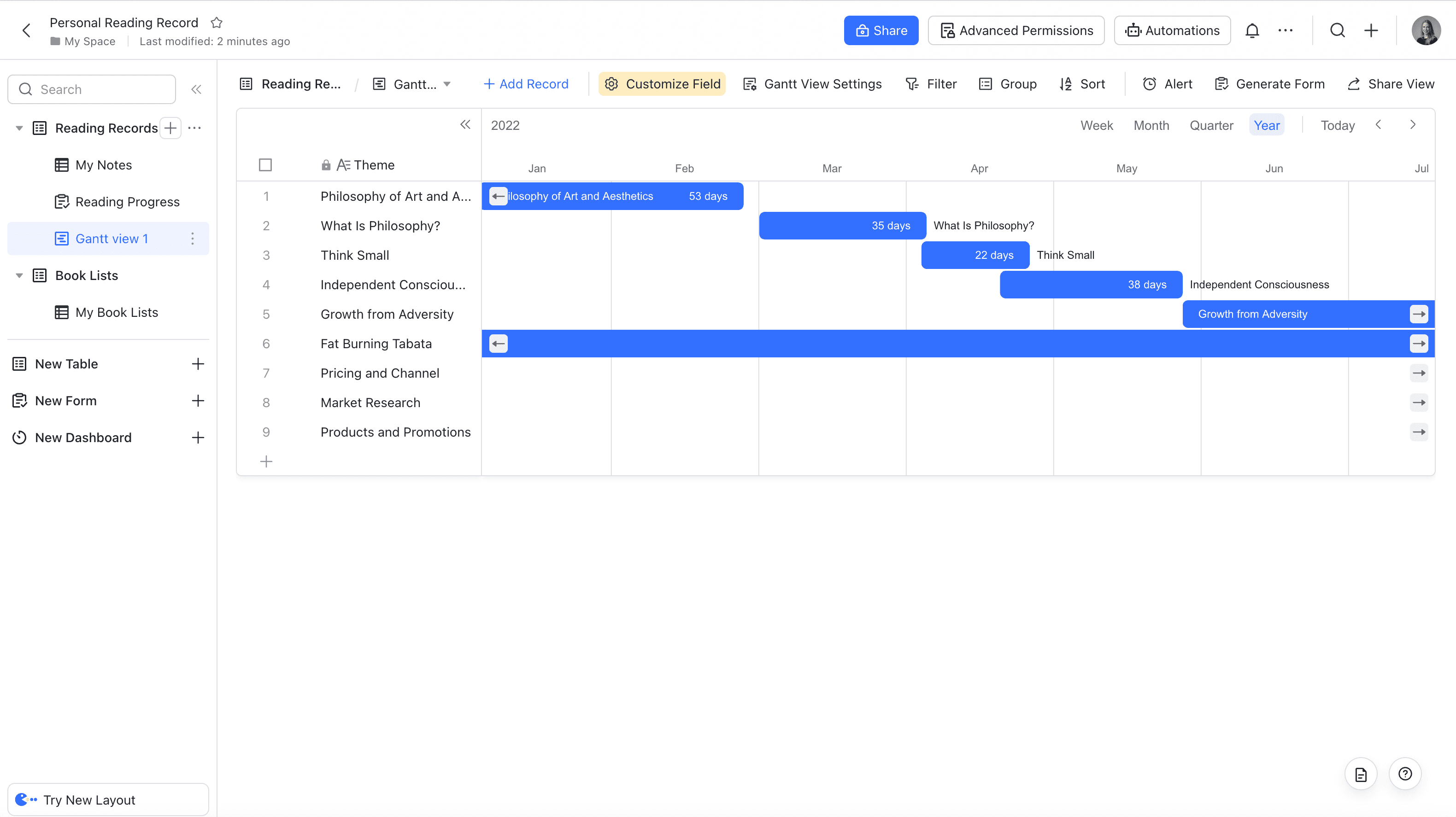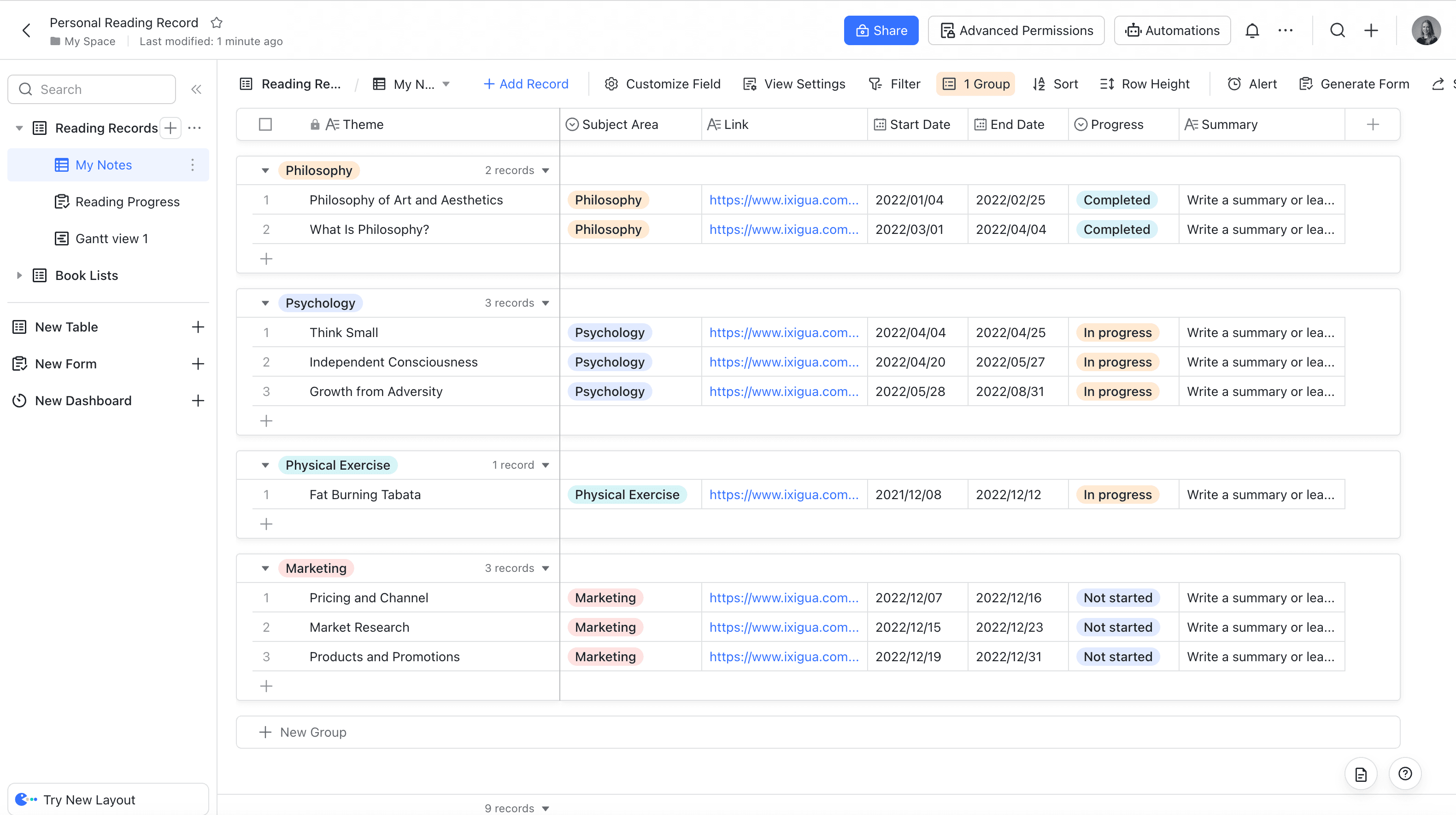Keeping track of your reading progress and insights can be a challenge, especially when you're juggling multiple books across various genres. Our Personal Reading Record template is designed to help you stay organized and focused on your reading goals. With Lark's user-friendly features, you can easily log the books you've read, their categories, your progress, and even write summaries or personal reflections on each book.
