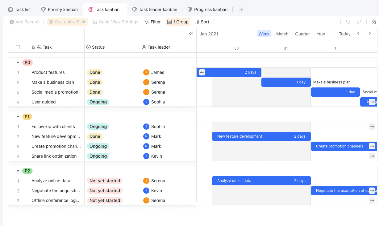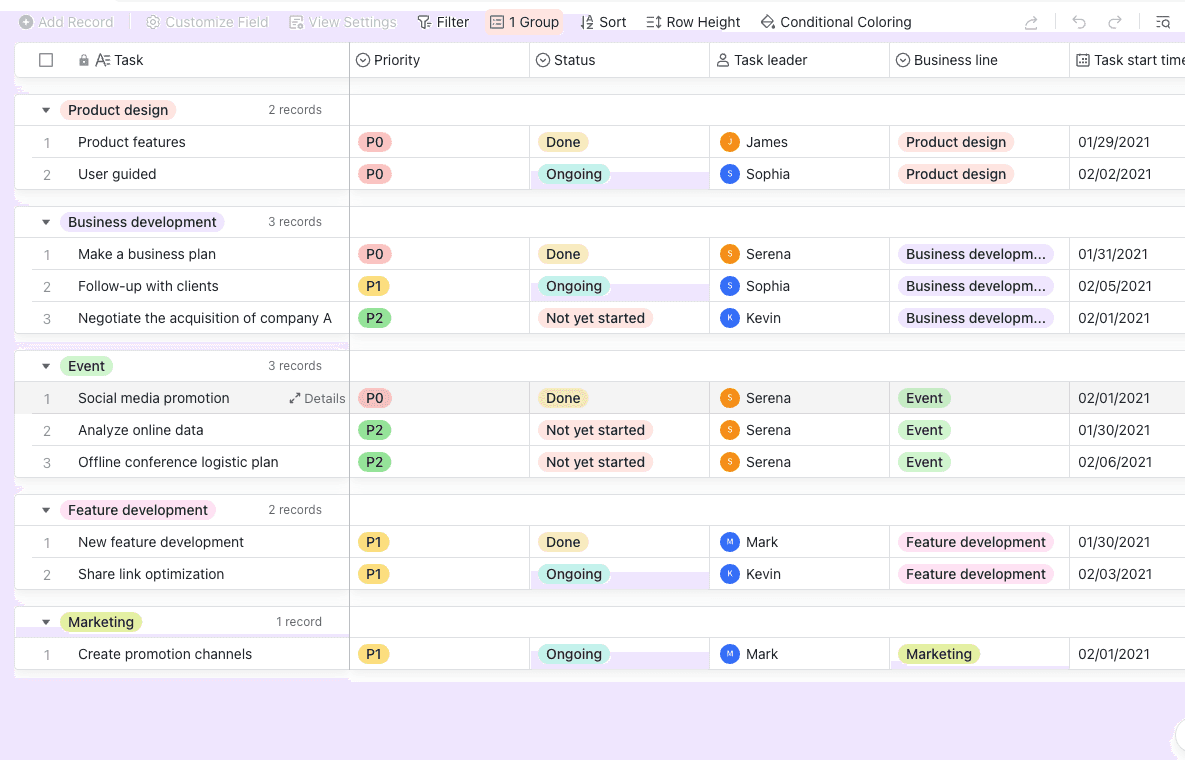 The Priorities-Kanban template is a comprehensive tool designed to help you manage and prioritize your tasks effectively. It allows you to add records of tasks, filter them based on priority, and sort them according to their status. The template is divided into different sections such as product design, business development, event planning, feature development, and marketing, each with its own set of tasks and priorities. It also includes a conditional coloring feature and allows you to adjust the row height for better visibility.