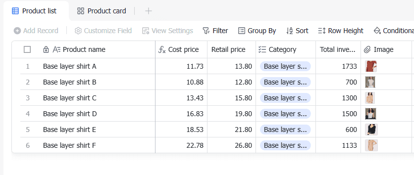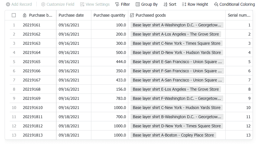 This template is a comprehensive system designed to manage procurement, sales, and inventory for chain stores. It includes sections for procurement management, sales management, inventory management, product management, and store management. The template allows you to track purchase lists, purchase dates, purchase quantities, purchased goods, and store details. It also includes features for adding records, customizing fields, filtering, grouping, sorting, and conditional coloring.