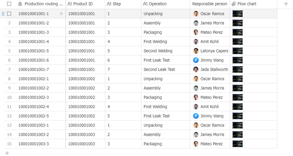 This Production Management template is designed to help you manage your production process more efficiently. It provides a clear routing of each production step, from unpacking to packaging, welding, and testing. Each step is associated with a unique product ID and a responsible person, ensuring accountability and smooth workflow. The template also includes a flow chart for visual representation of the process, making it easier to understand and follow.