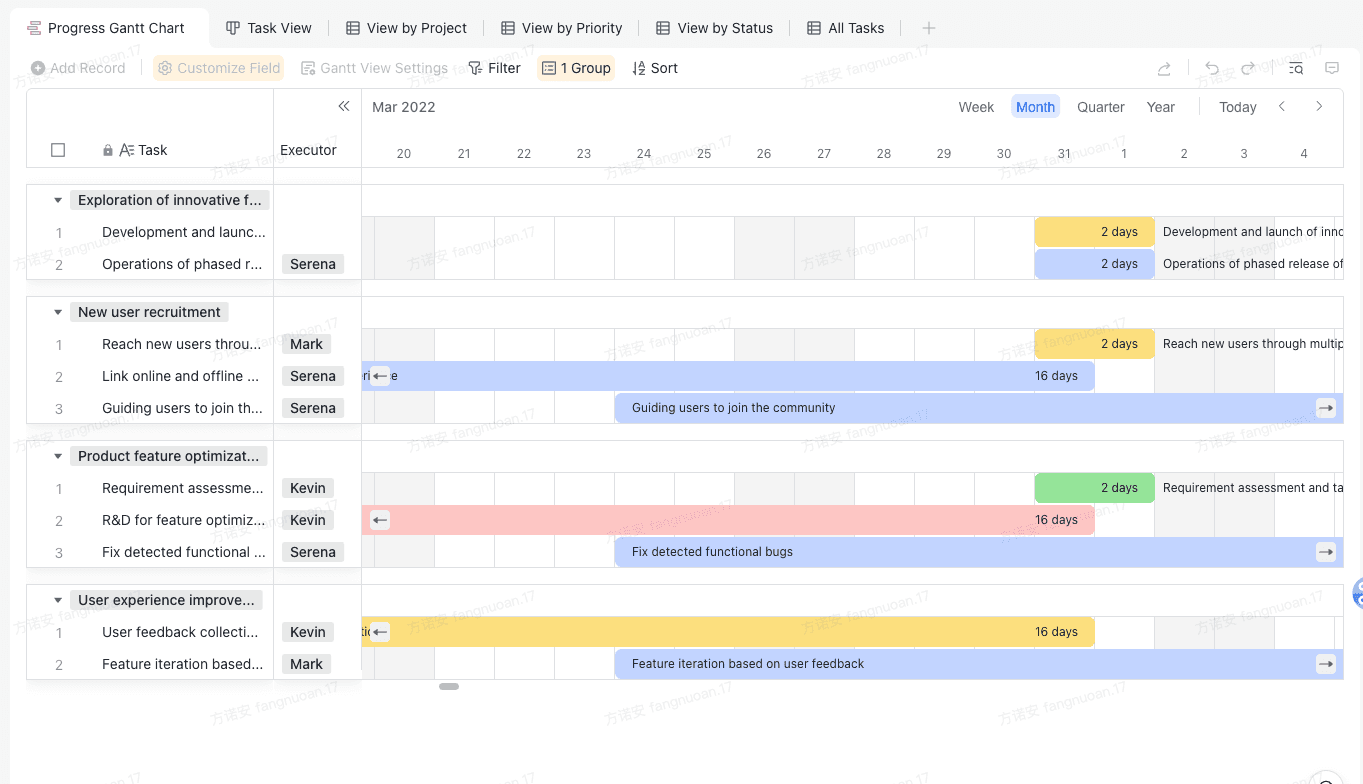 The Project Roadmap Gantt Chart template is a visual tool for project planning and tracking. It allows you to display the project timeline, the tasks involved, and who is responsible for each task. It also provides a clear view of the project's progress, with tasks displayed against time. This template includes features such as task view, project view, priority view, and status view. It also allows for customization of fields and settings, including filters, groups, and sorting options.