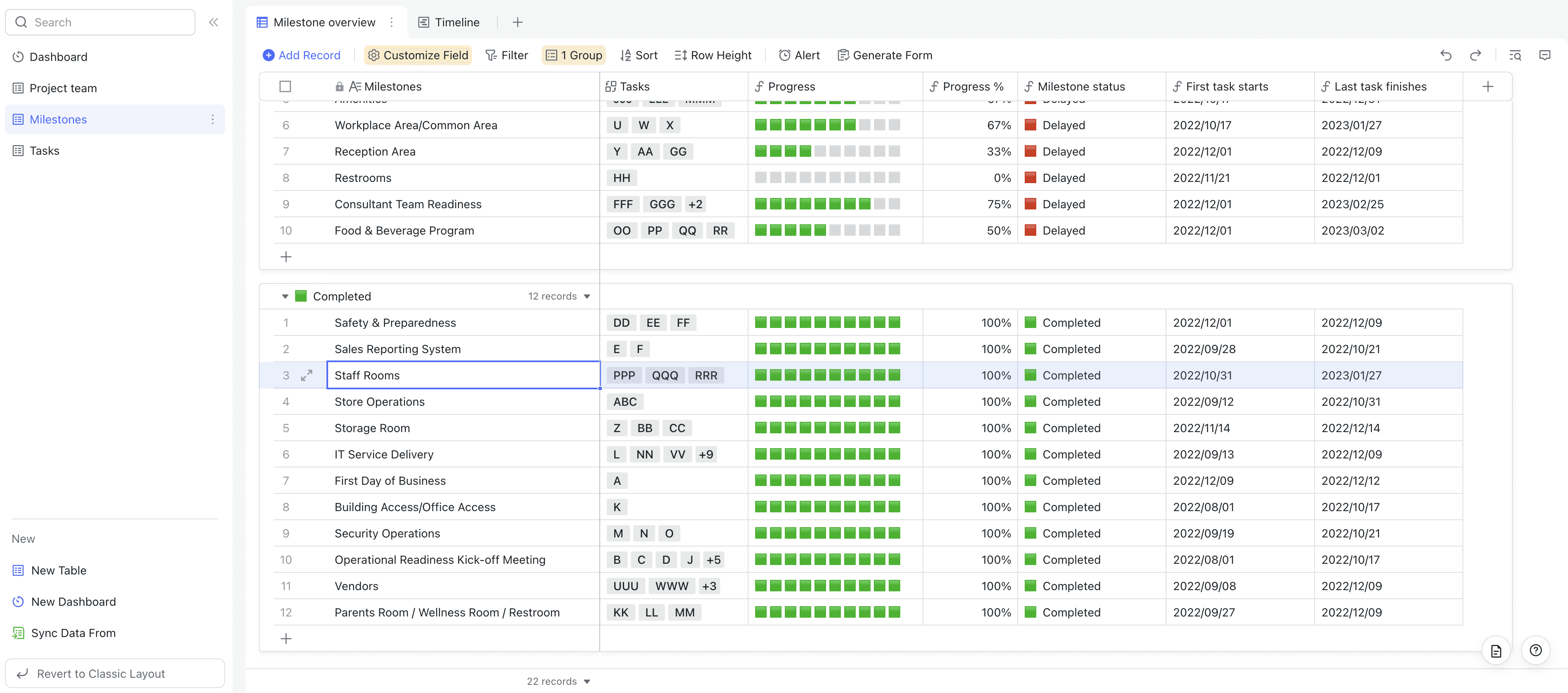 Coordinate with multiple teams to ready a new property from scratch, with team, milestones, and tasks clearly listed and tracked.