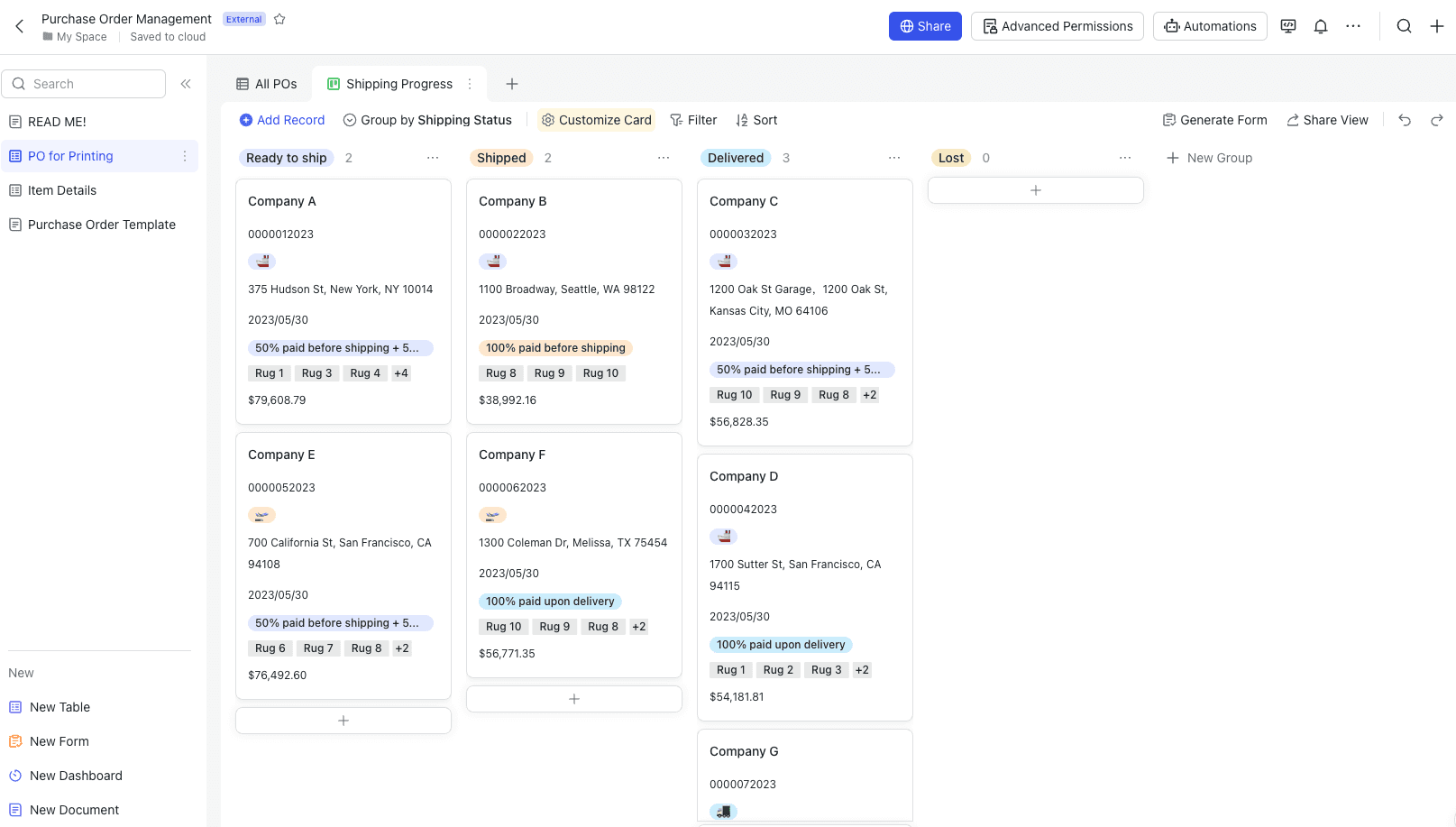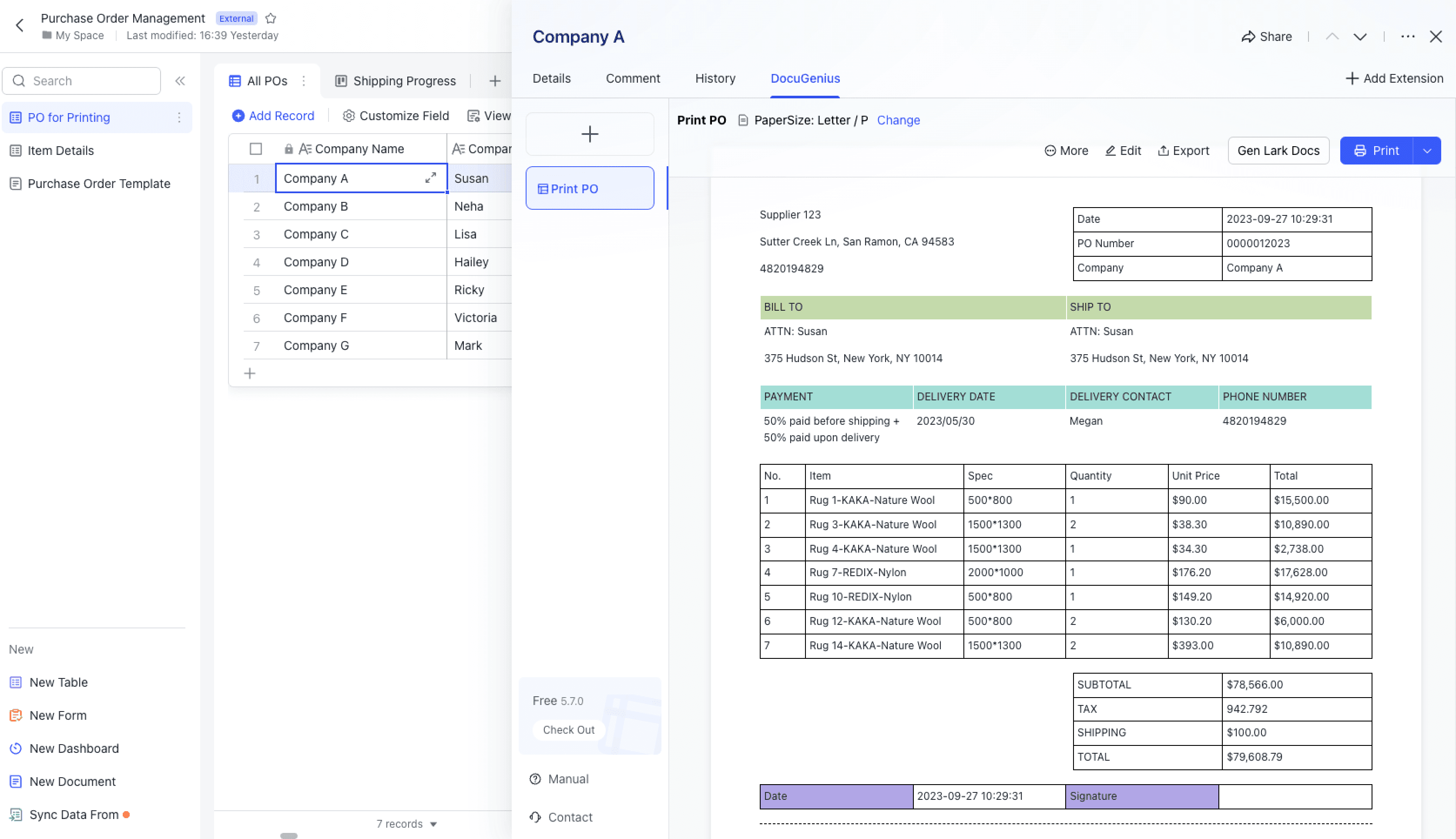 Efficiency Optimization: Utilize our digital purchase order system to streamline the purchase order process, enabling swift creation, seamless management, and easy printing using the extension embeded in Lark Base, saving time and reducing errors.