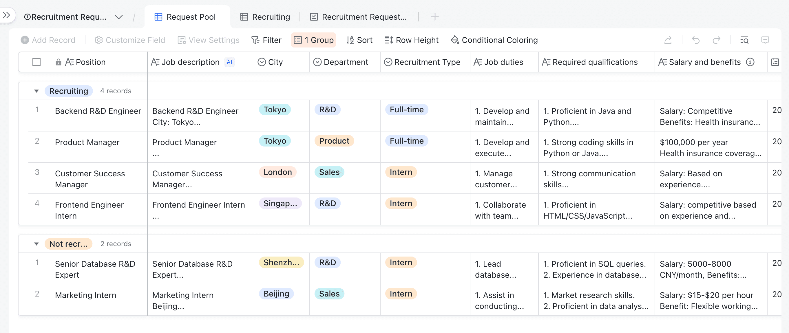 Recruitment is a crucial process for any organization, but it can often be time - consuming and complex. This is where the Recruitment Request Management template comes in. It allows you to streamline your recruitment process, making it more efficient and effective. With its intuitive design and advanced features, you can easily track progress, manage candidate information, and visualize data. This not only saves you time but also helps you make more informed decisions. Plus, with its customizable fields, you can tailor the template to fit your specific needs. So why wait? Start optimizing your recruitment process today with the Recruitment Request Management template.