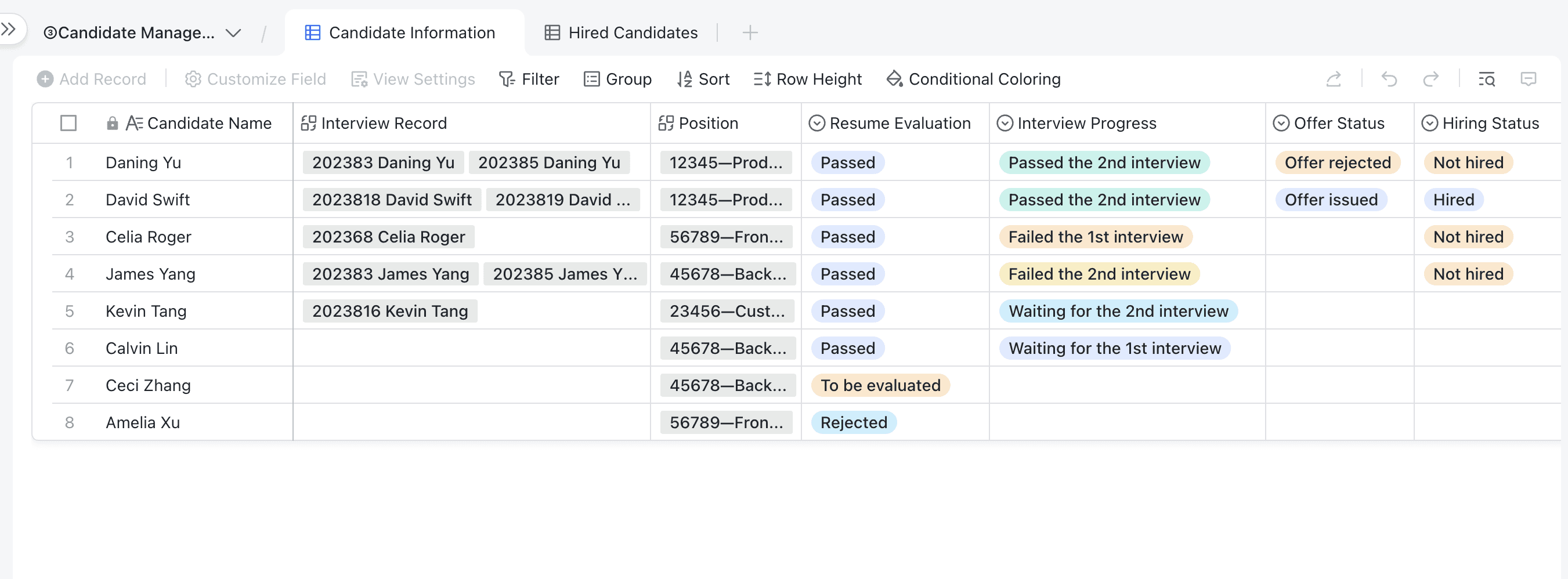 The Recruitment Request Management template is a comprehensive tool designed to simplify and streamline the recruitment process. It allows you to insert questions related to existing fields, edit both the question and question description, and automatically synchronize information to Base upon submission. It also includes a Kanban View for intuitive progress tracking and data management, and a two - way link field for efficient navigation between two tables. Additionally, it features dashboards for data visualization, utilizing column, funnel, and pie charts to help you make data - driven decisions.