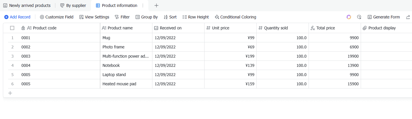 The Retail Performance Analysis template is a comprehensive tool designed to help you track and analyze your retail performance. It allows you to input and monitor various product information such as product code, product name, received date, unit price, quantity sold, total price, product display, and supplier. It also provides a form view for easy data entry and a customizable field view for personalized data visualization.